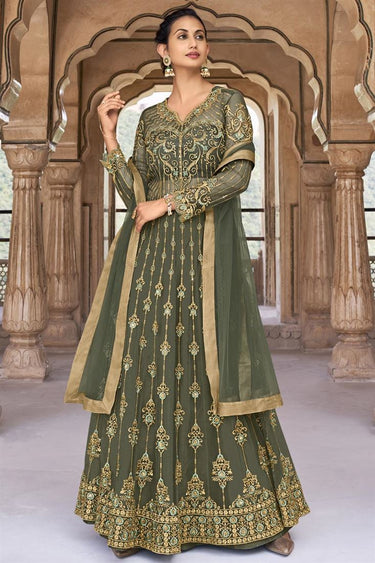 Beautiful Net Mehendi Green Embroidered Anarkali Salwar Suit