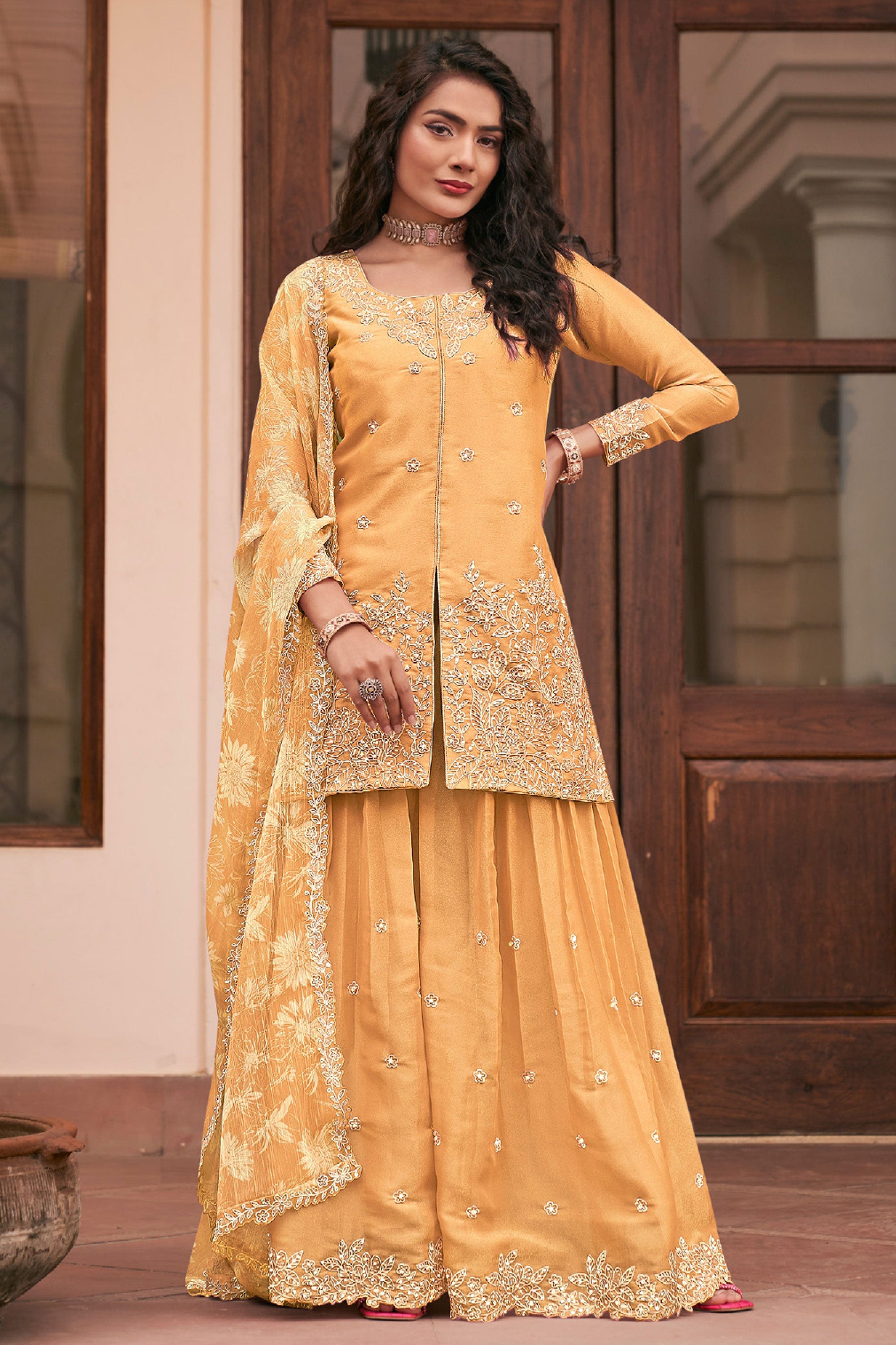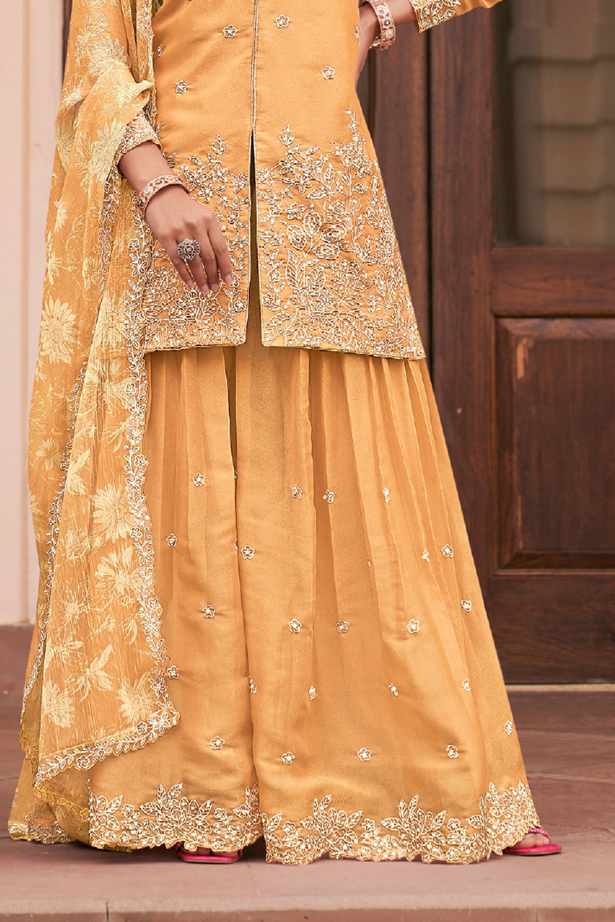 Step into elegance with this stunning Readymade Palazzo Suit, perfect for special functions and festive occasions. The top is crafted from heavy premium MOS silk and beautifully enhanced with intricate heavy embroidery work, giving it a rich and graceful appeal. It is paired with a comfortable heavy premium silk palazzo bottom that adds a stylish flow to the outfit. Completing the look is a heavy premium Bemberg chiffon dupatta featuring elegant digital prints and detailed embroidery work, adding charm and sophistication to the ensemble. Note: Due to digital photography, slight color variations may occur.