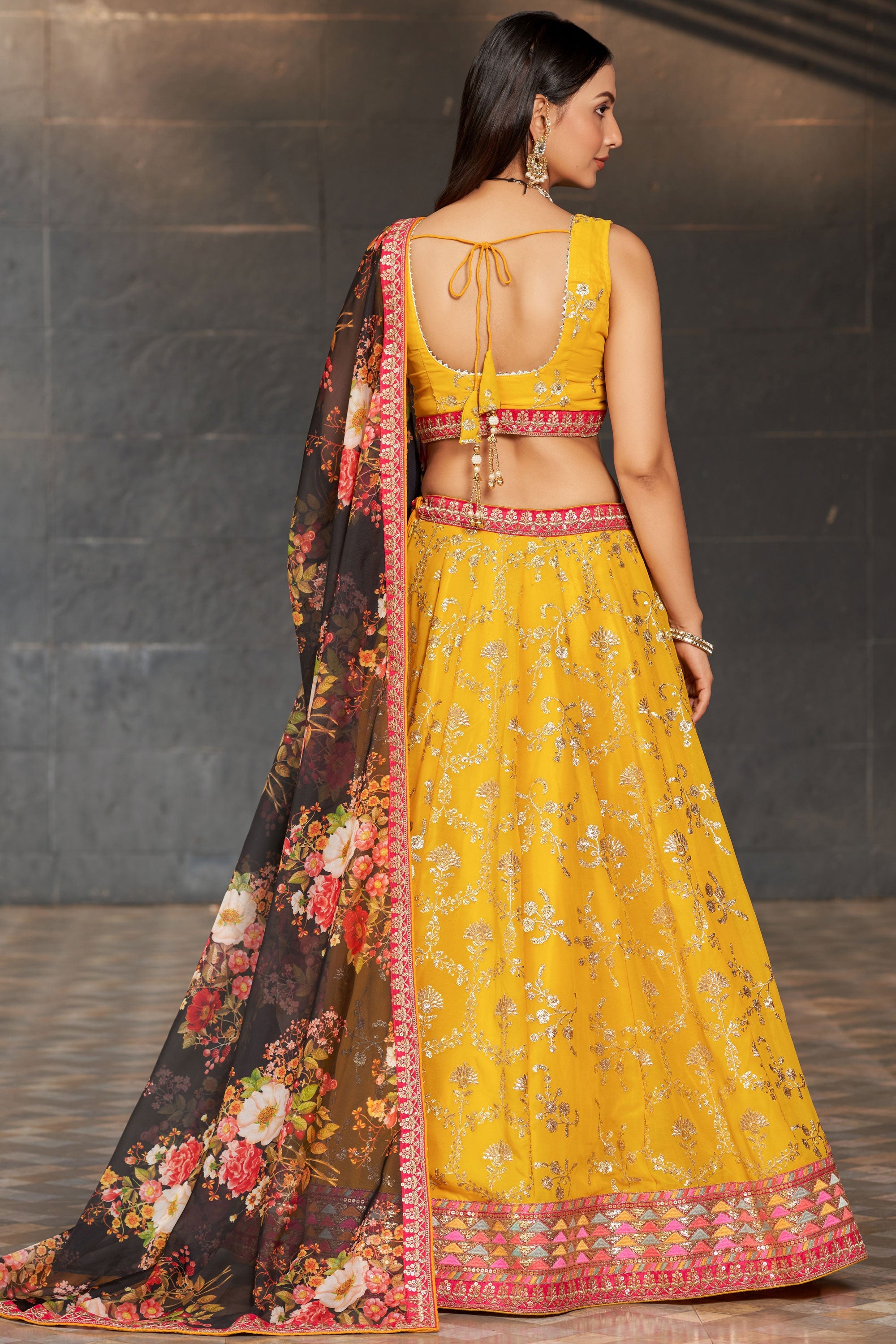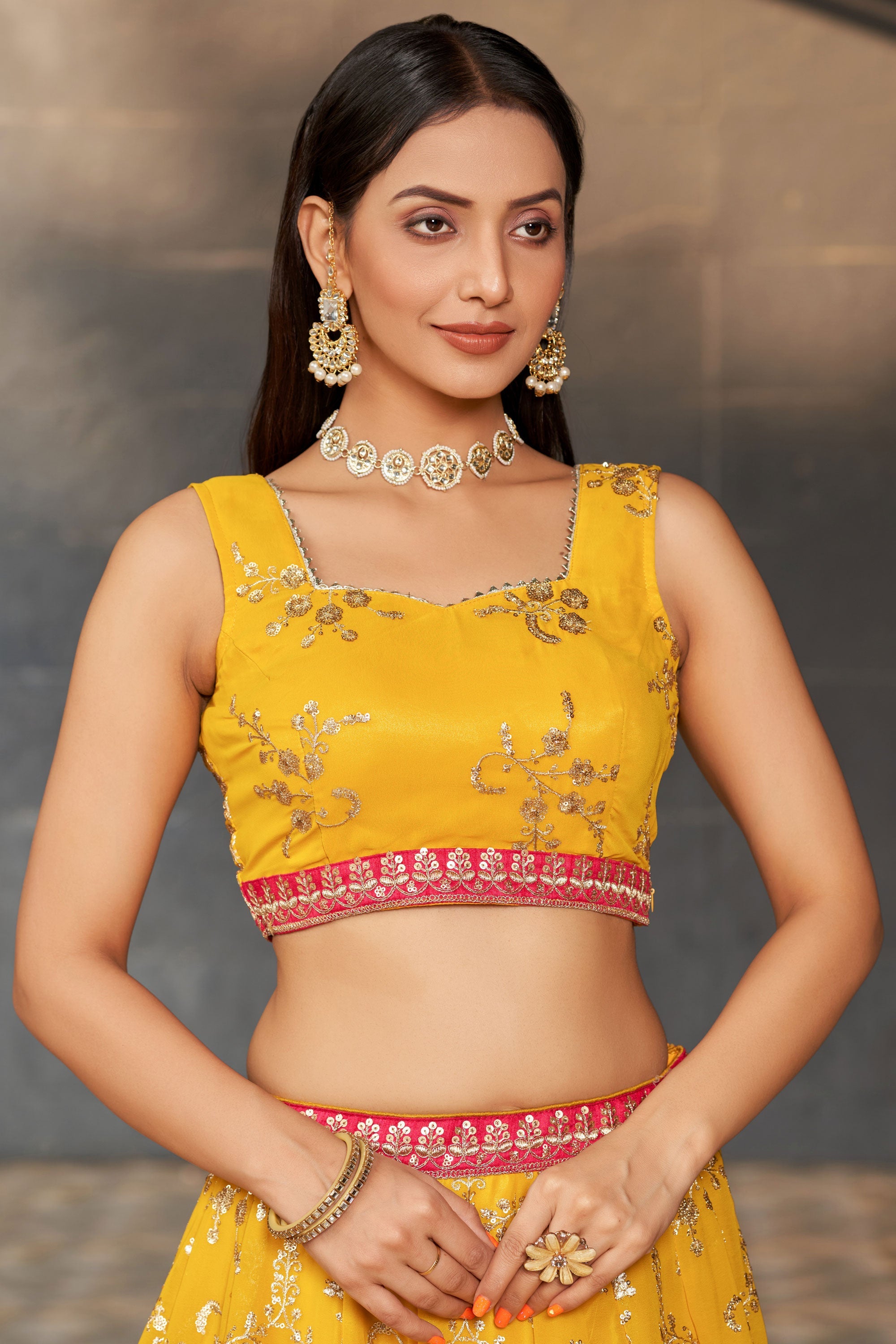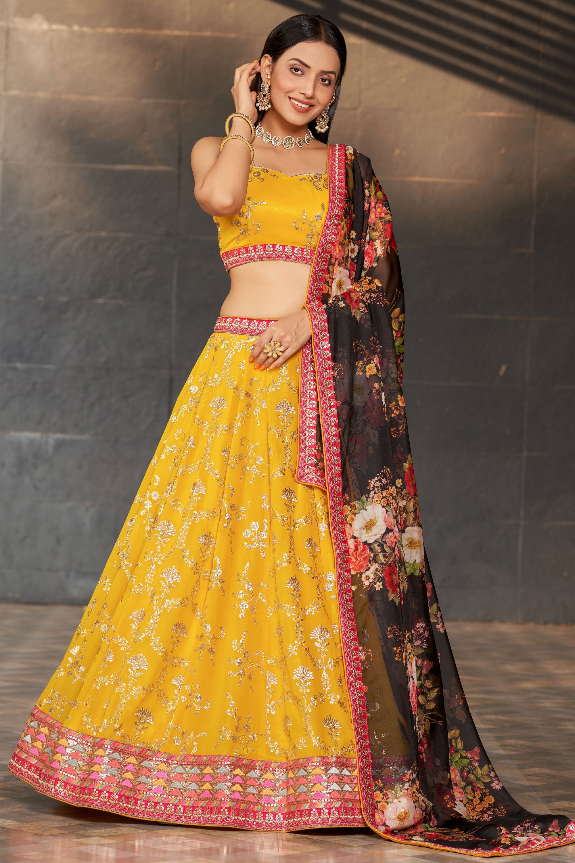 Beguiling Sequins Work On Yellow Color Georgette Fabric Lehenga