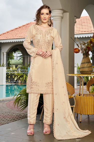 Beige Chinon Silk Embroidered Readymade Designer Salwar Kameez