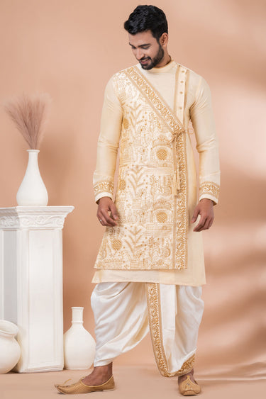 Beige Color Function Wear Readymade Glamorous Embroidery Kurta Pyjama For Men In Viscose Fabric