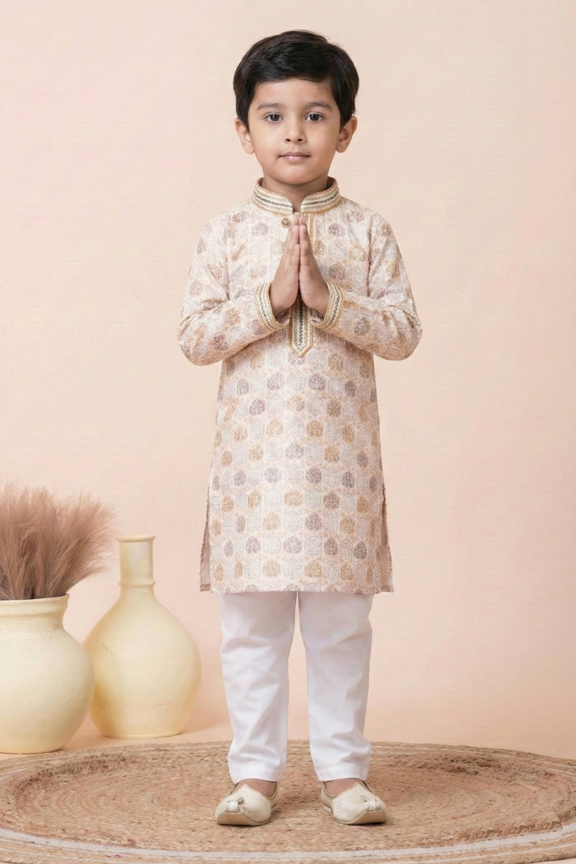 Beige Cotton Fabric Boys Readymade Kurta Pyjama For Festive Wear