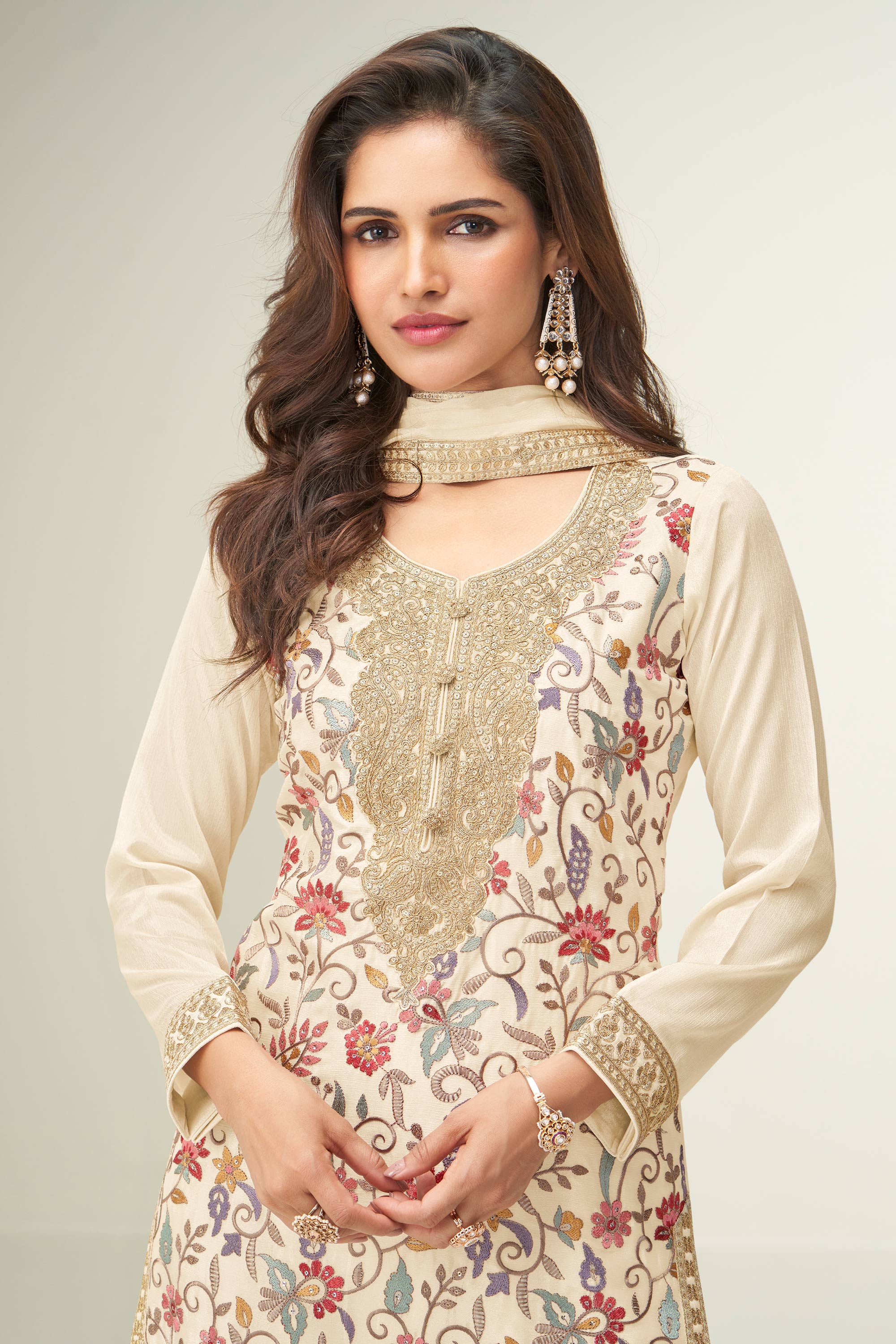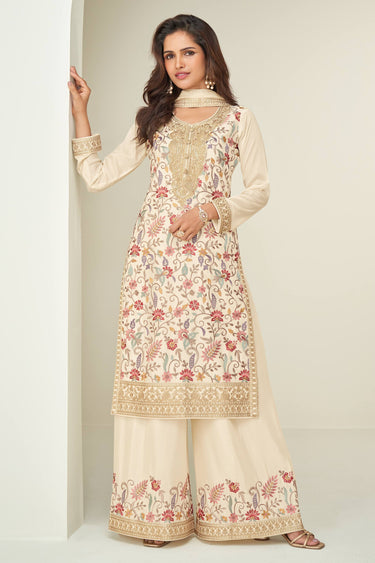 Beige Embroidered Synthetic Readymade Palazzo Salwar Suit