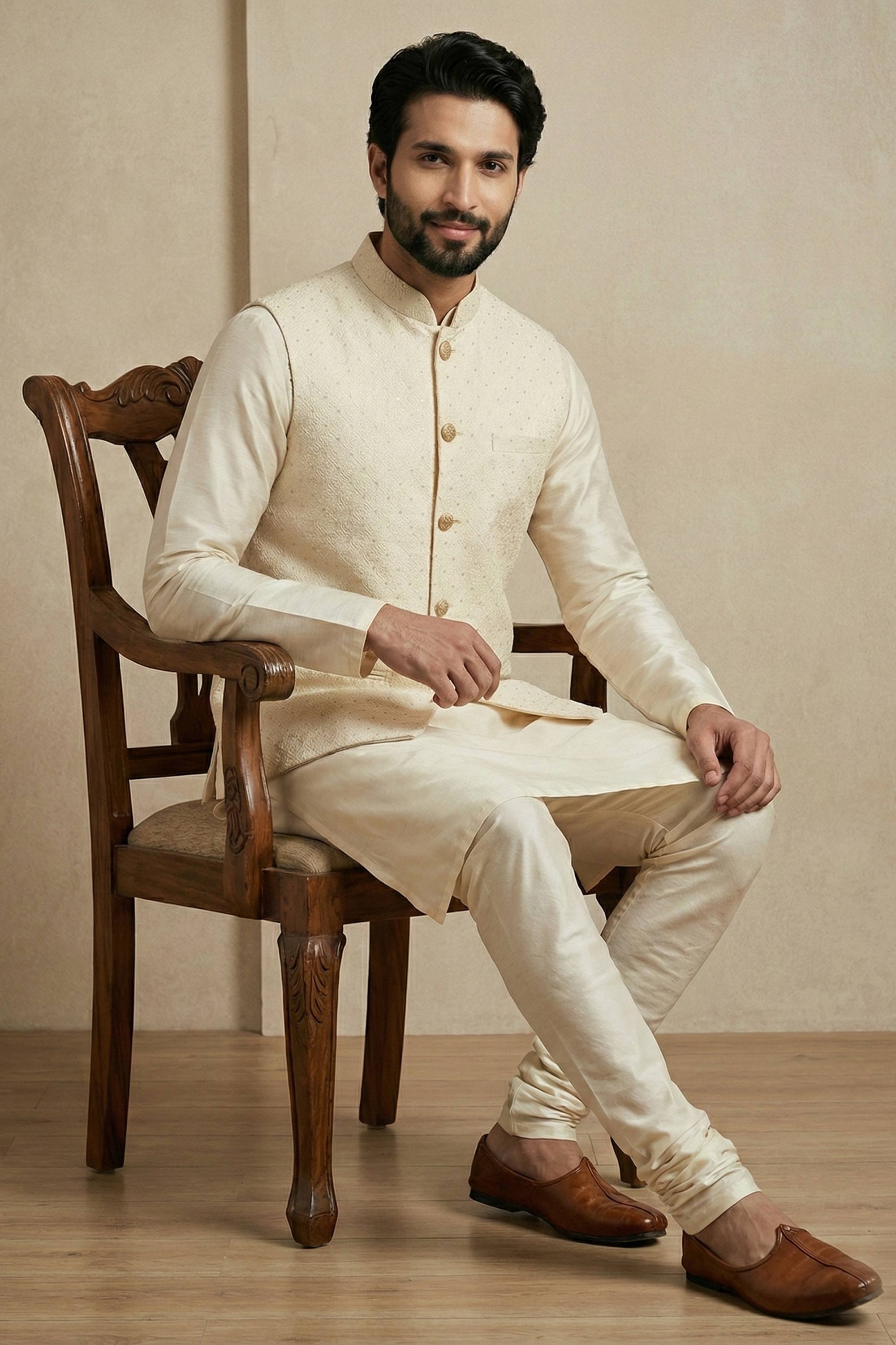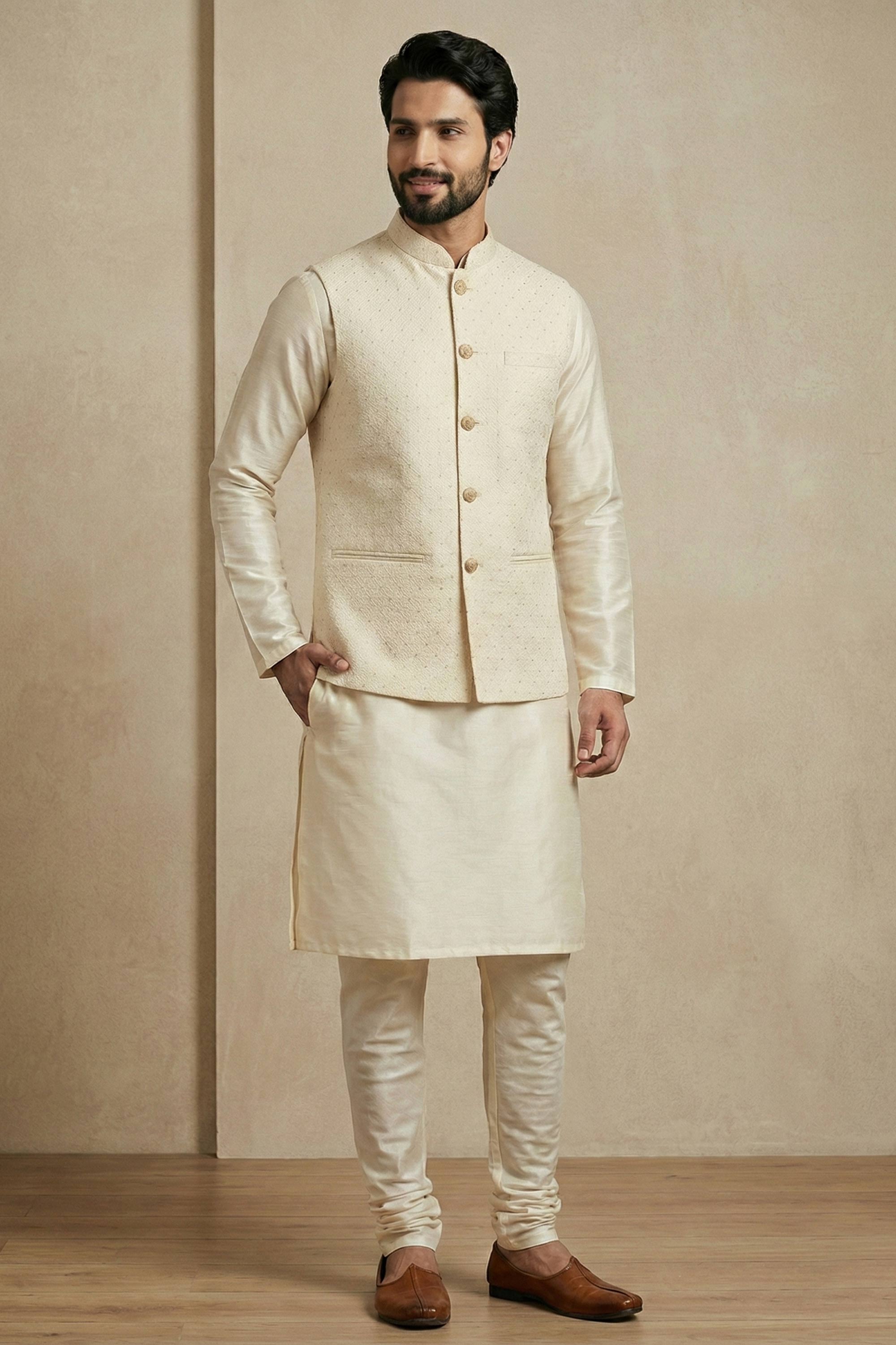 Beige Function Wear Dhupion Fabric Men Readymade Kurta Pyjama With Designer Jacket