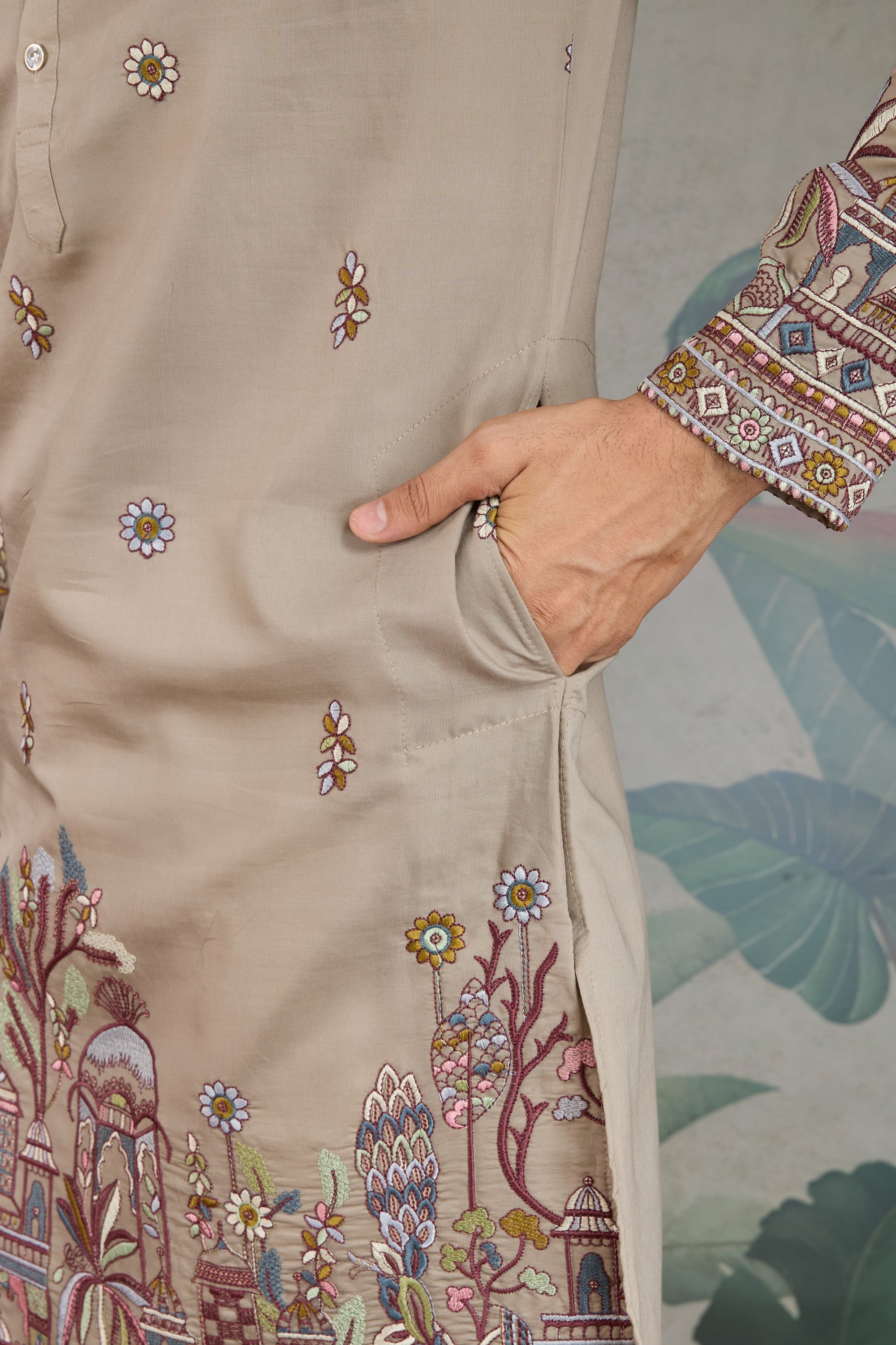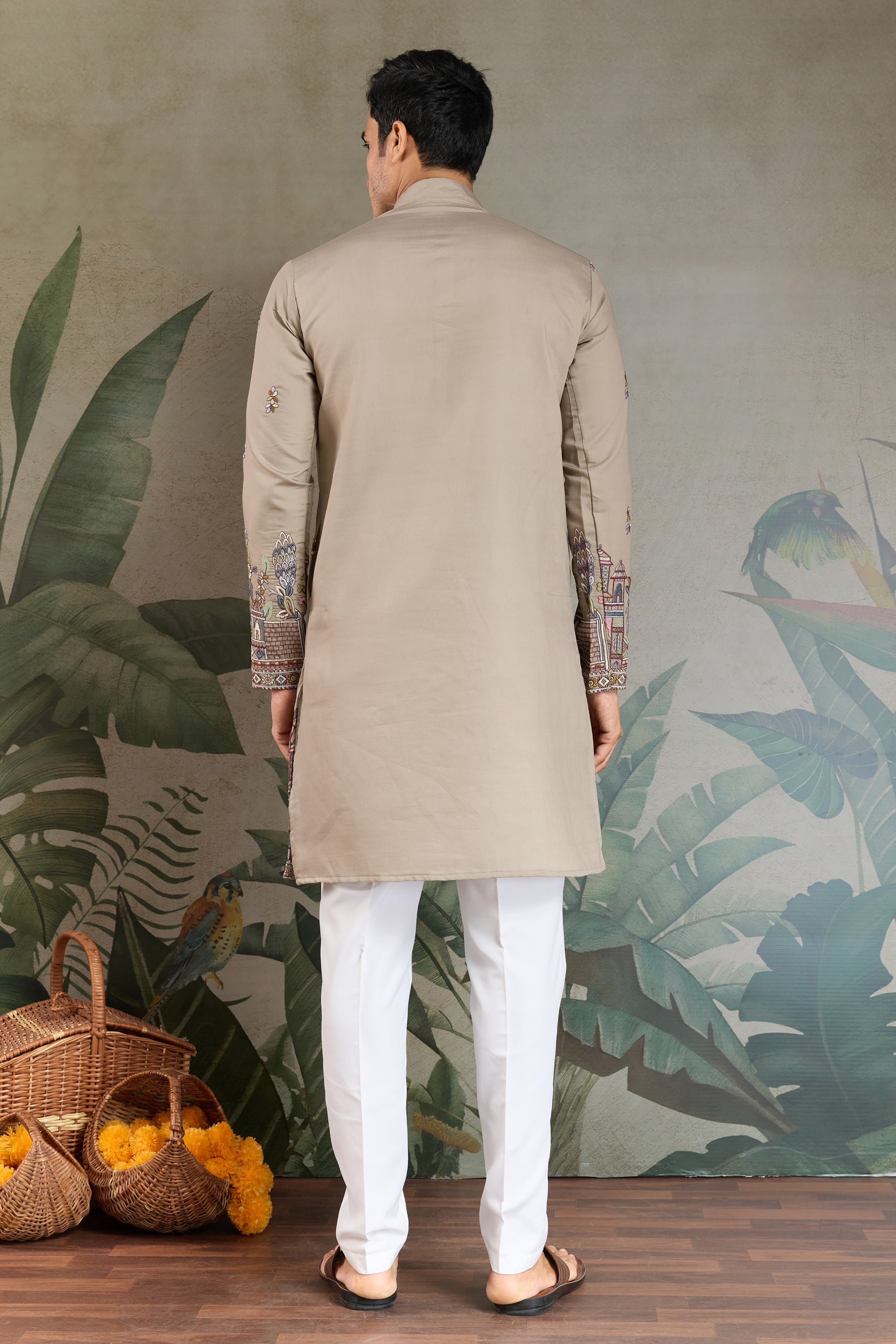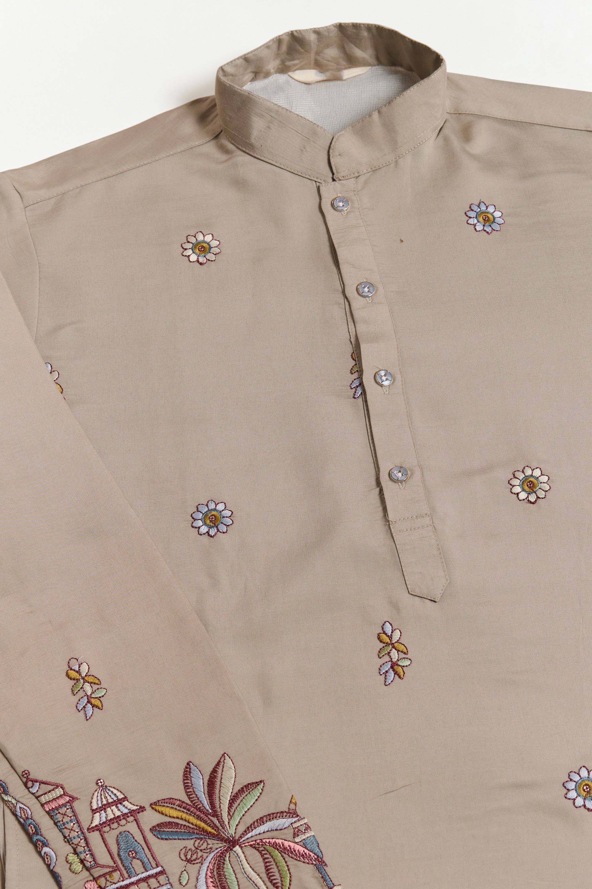 Beige Sequins Embroidery Viscose Silk Readymade Men Kurta With Dupatta