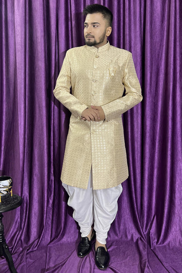 Beige Silk Fabric Graceful Readymade Men Peshawari Style Indo Western For Wedding Wear