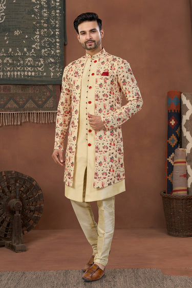 Beige Wedding Wear Banarasi Silk Fabric Readymade Indo Western For Men