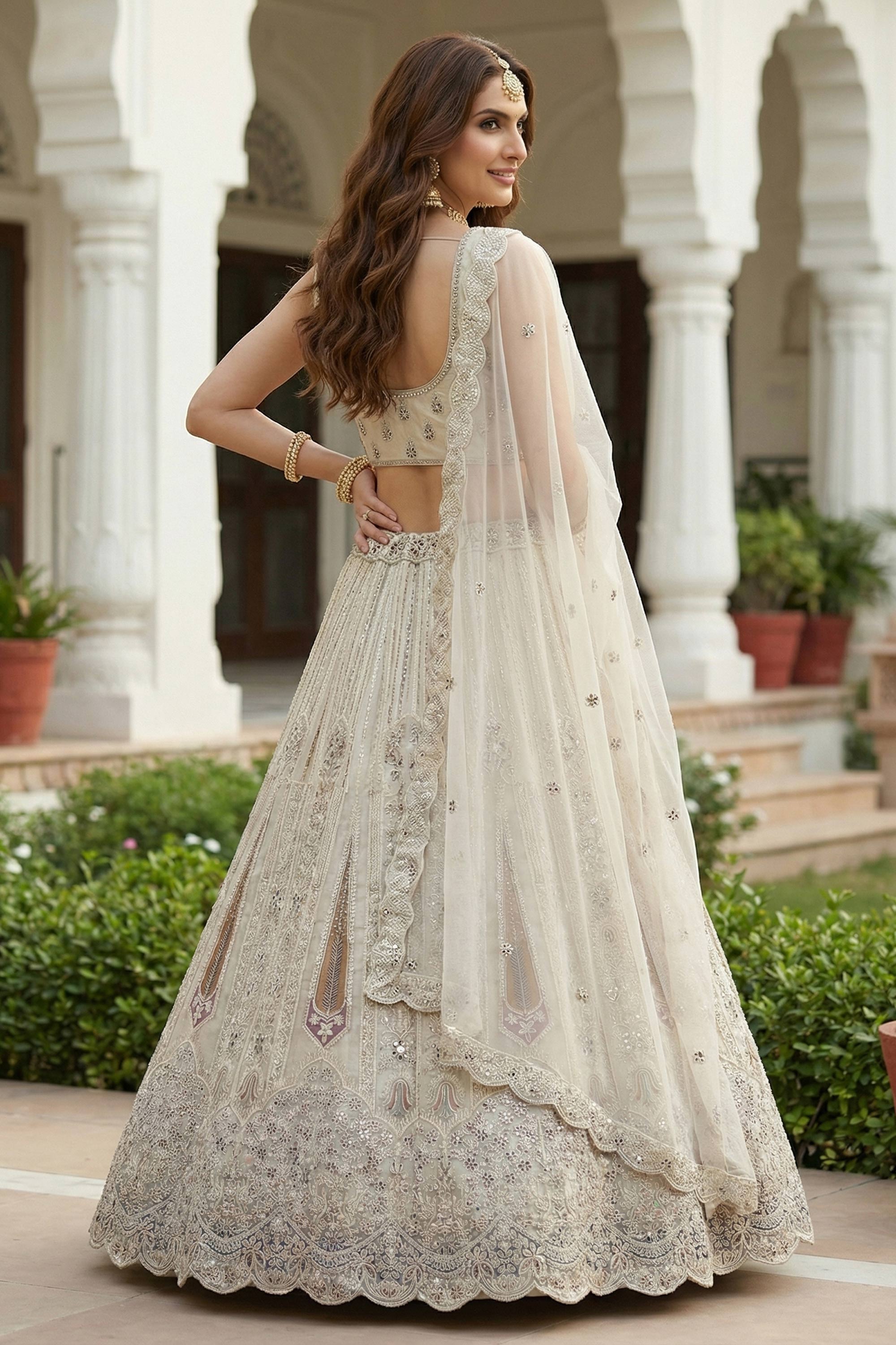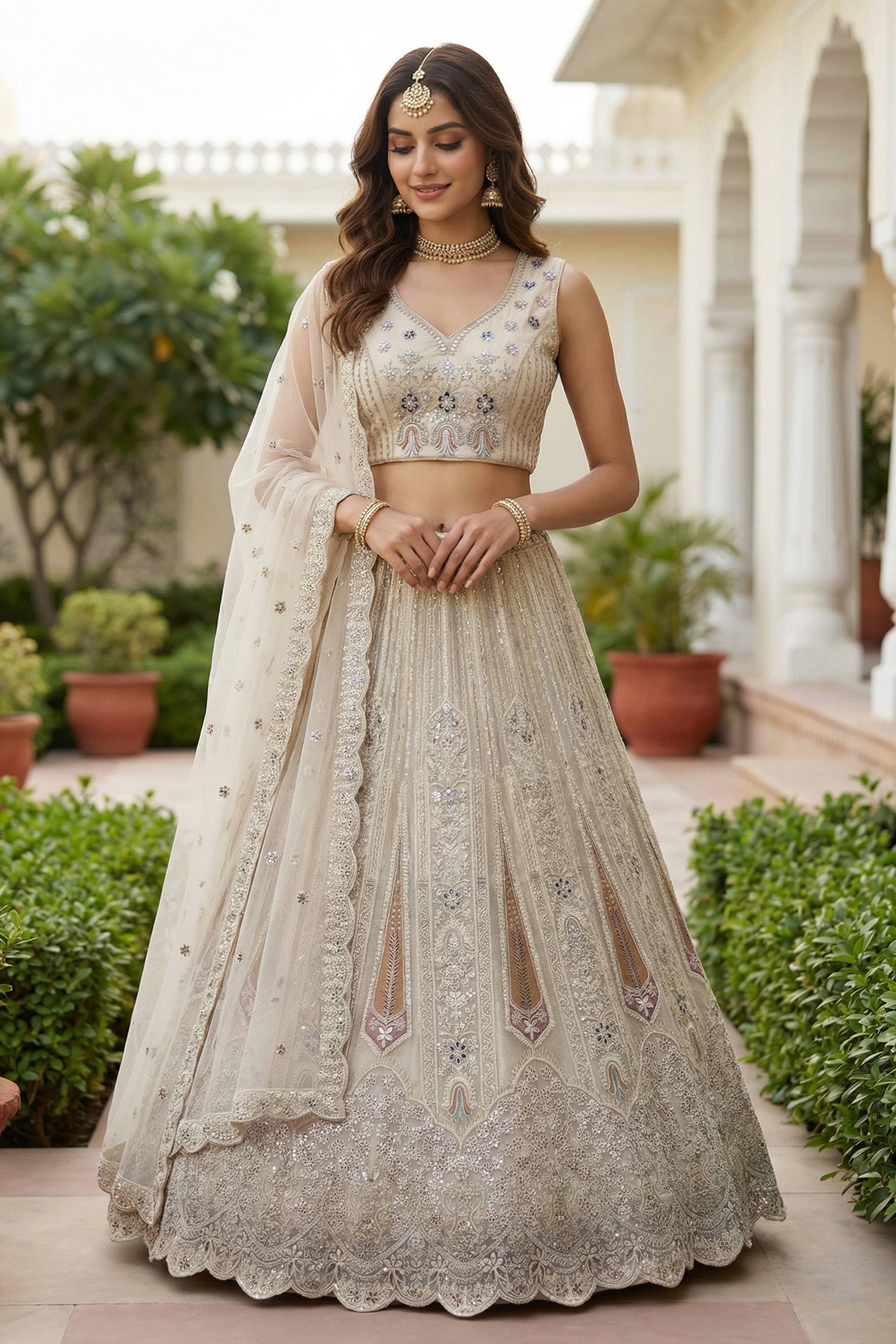 Beige Wedding Wear Embroidered Net Lehenga Choli