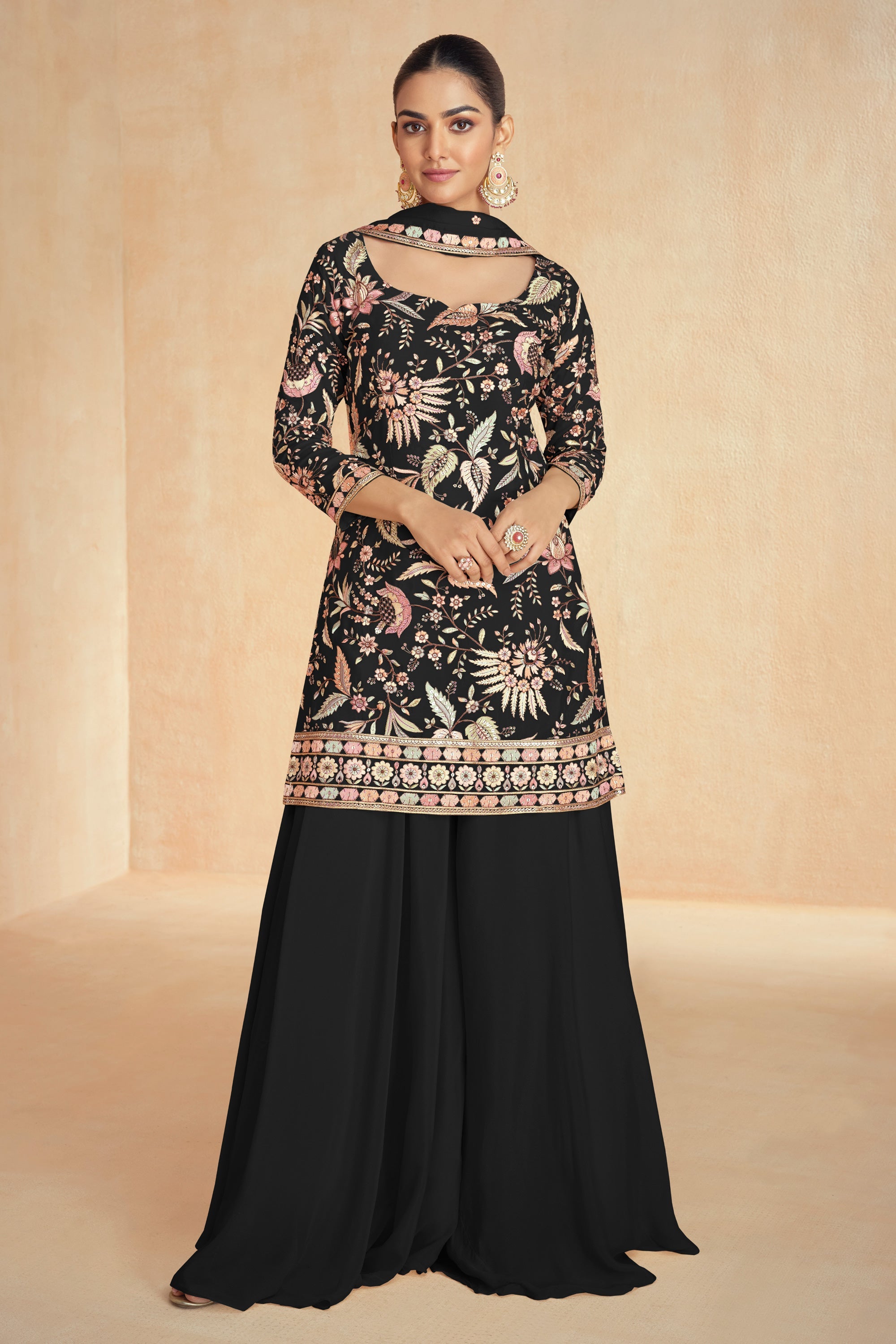 Black Color Chinon Silk Embroidered Readymade Palazzo Salwar Kameez