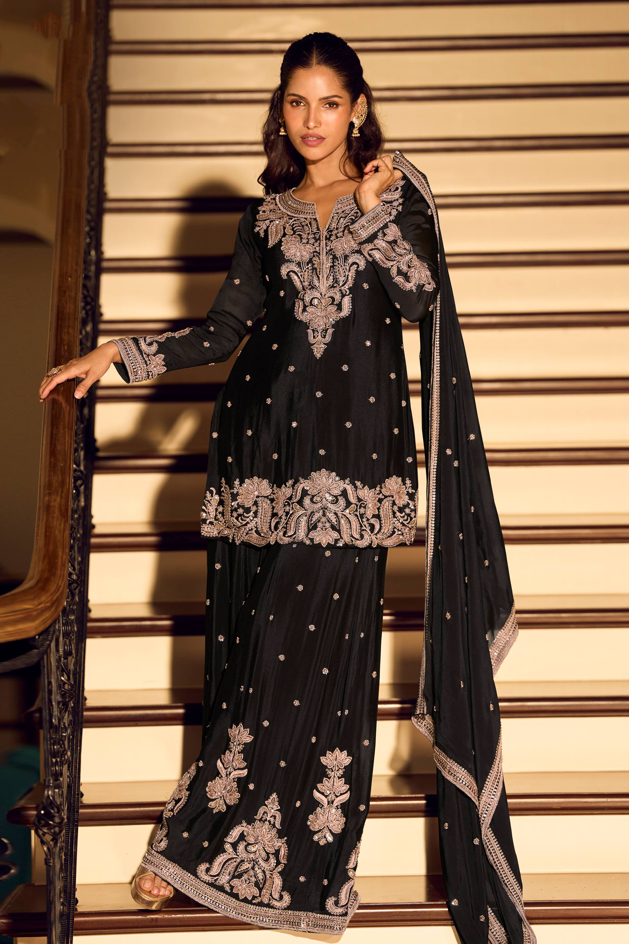 Black Sangeet Wear Chinon Silk Embroidered Readymade Palazzo Suit
