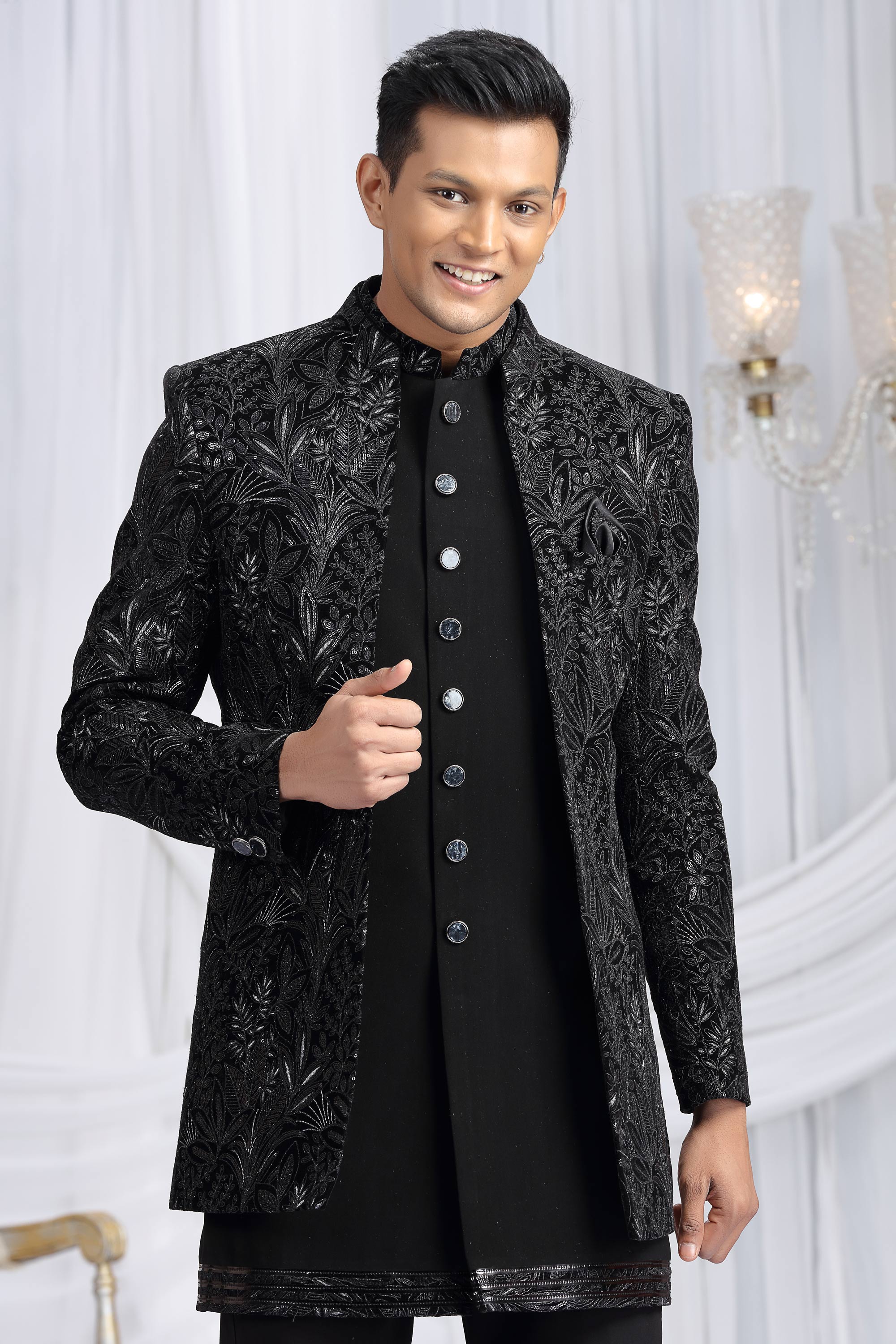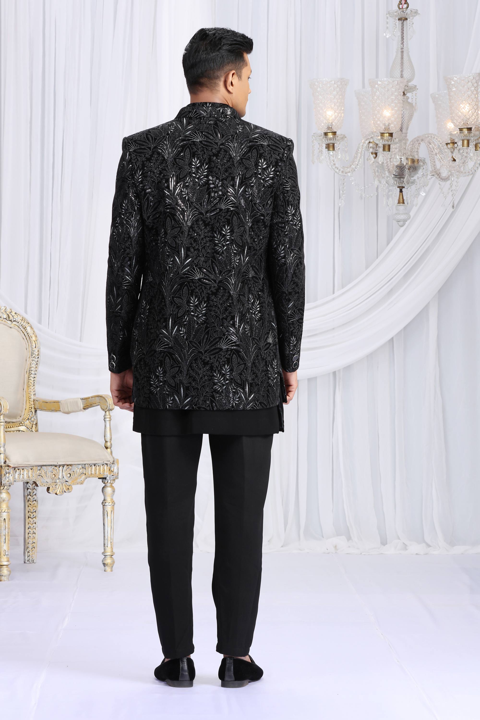 Black Velvet Silk Readymade Indo Western For Men