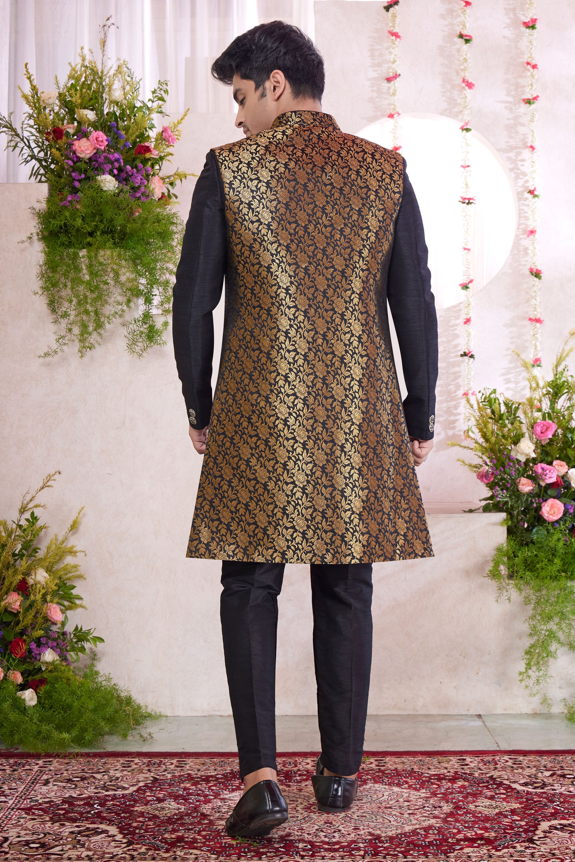 Black Wedding Wear Readymade Glamorous Indo Western For Men In Jacquard Art Silk Fabric