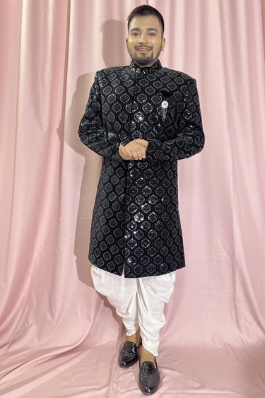 Black Wedding Wear Readymade Glamorous Indo Western For Men In Velvet Fabric