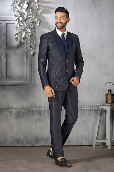 Blissful Navy Blue Color Satin Fabric Coat Suit