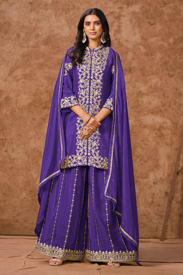 Make a statement with our Chinon Fabric Palazzo Salwar Suit, tailored for a flawless look at any event. This stunning set features a finely embroidered top, flowing palazzo bottoms, and an elegant dupatta. The Chinon fabric offers a soft, luxurious feel, while its airy quality ensures ease of movement. Available in a range of captivating colors, this suit can be accessorized with your favorite bangles and high heels for a truly polished ensemble. Perfect for ceremonies, gatherings, and other celebrations, it's a chic choice for the modern woman.