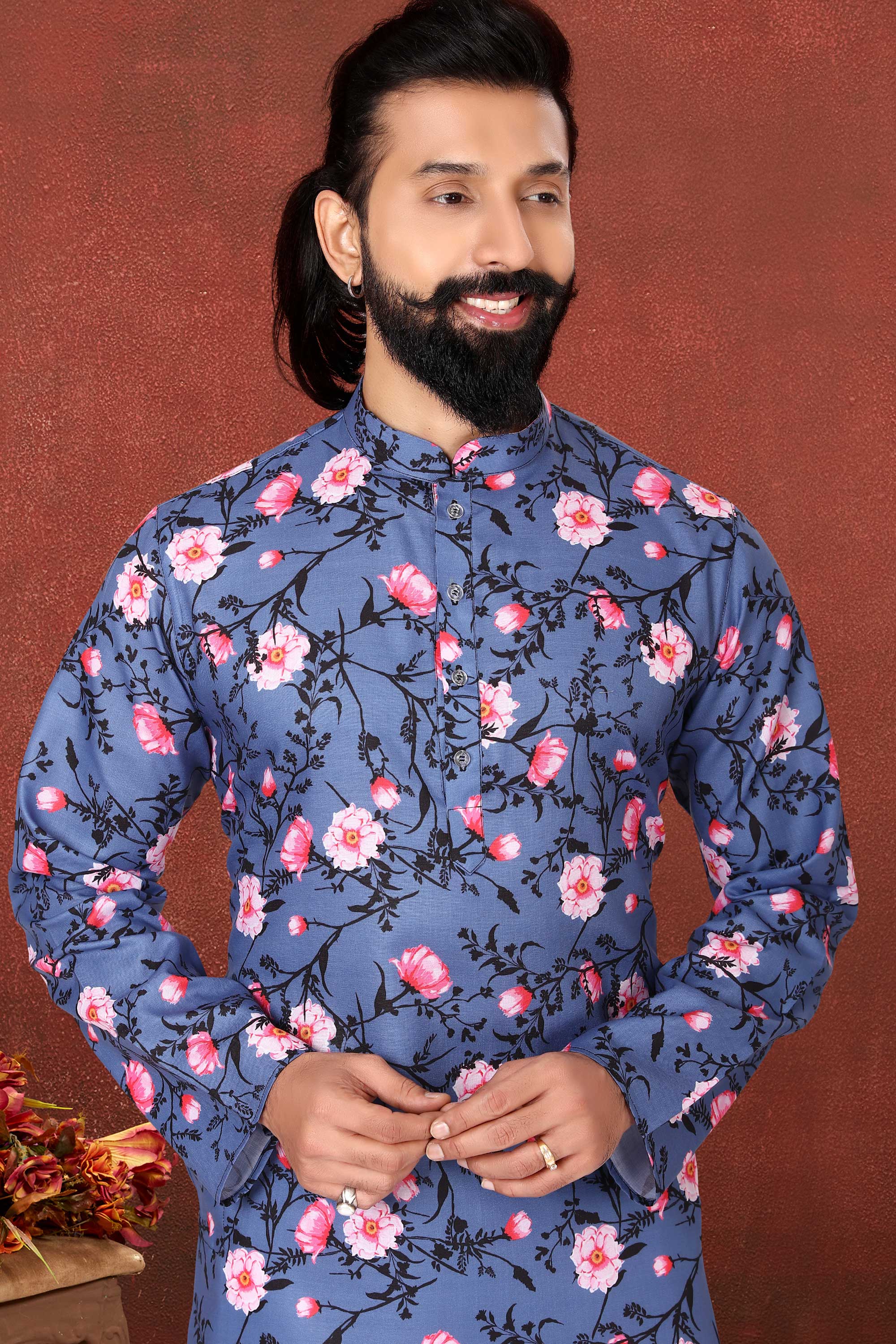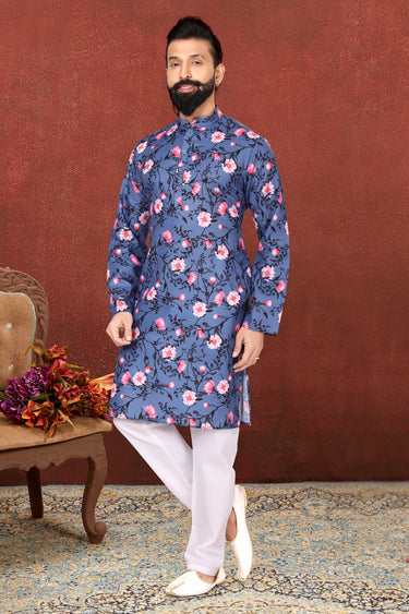 Blue Cotton Graceful Readymade Men Kurta Pyjama For Festive Wear