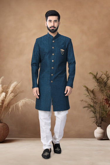 Blue Silk Festive Wear Captivating Readymade Indo Western For Men