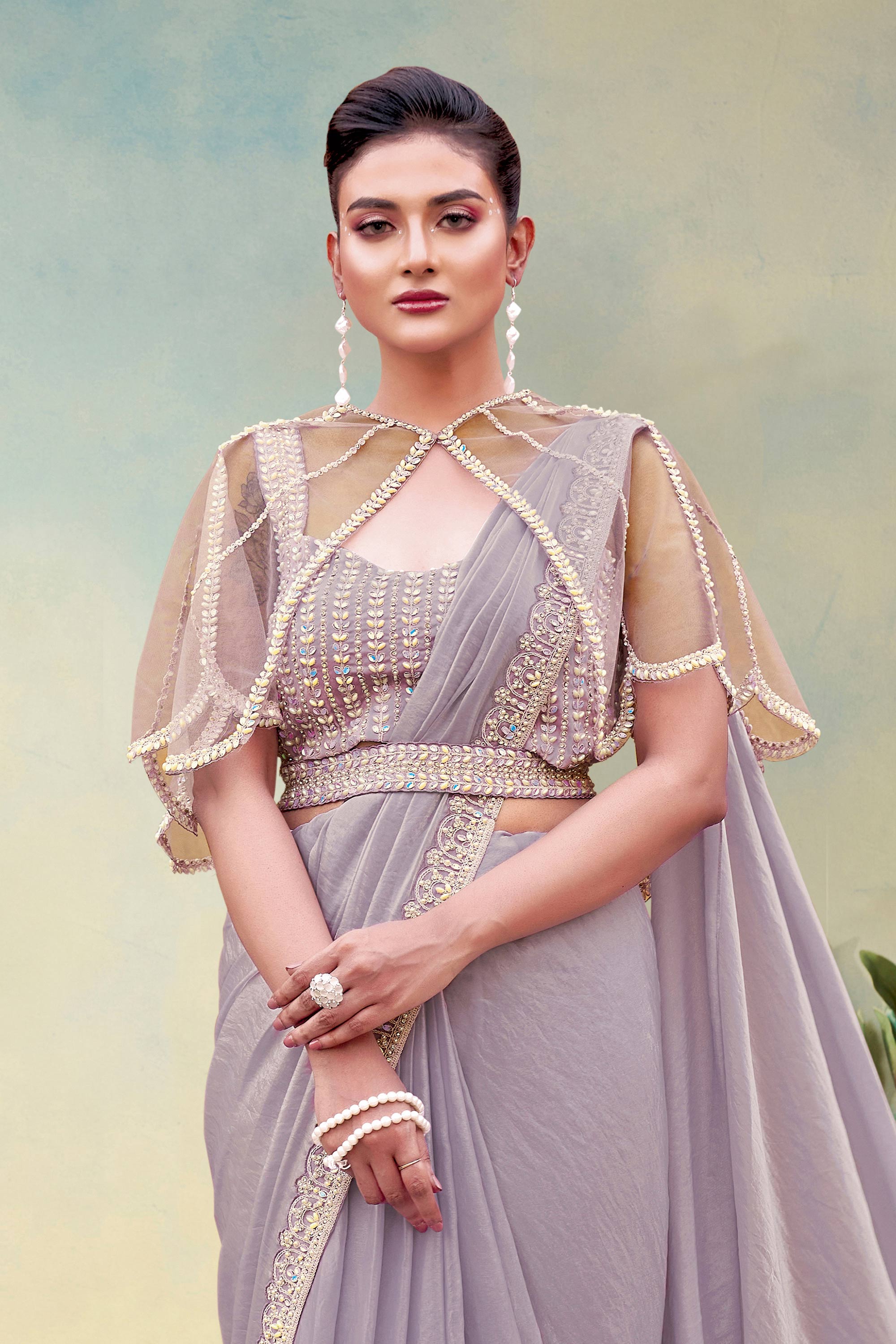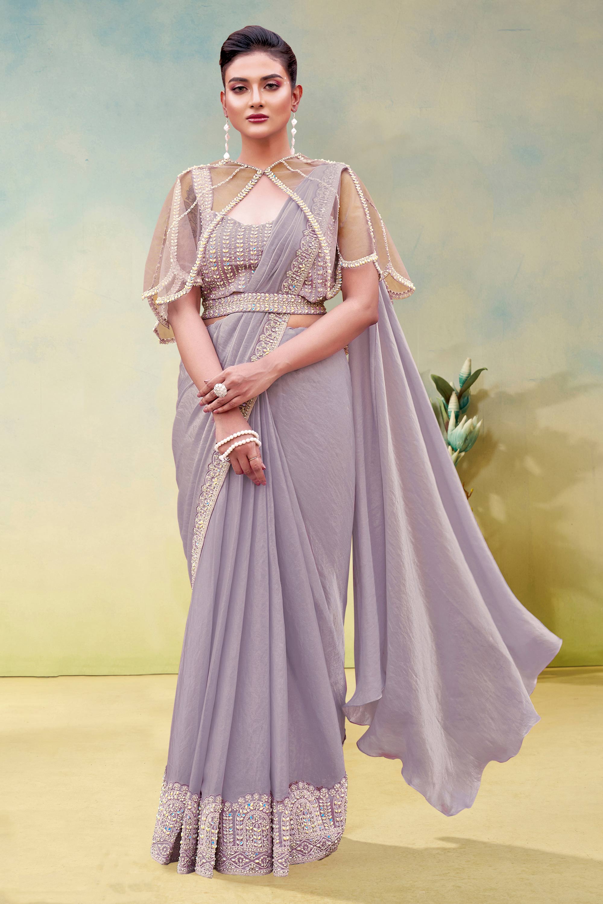 Border Work Satin Silk Lavender Readymade Saree For Wedding Wear
