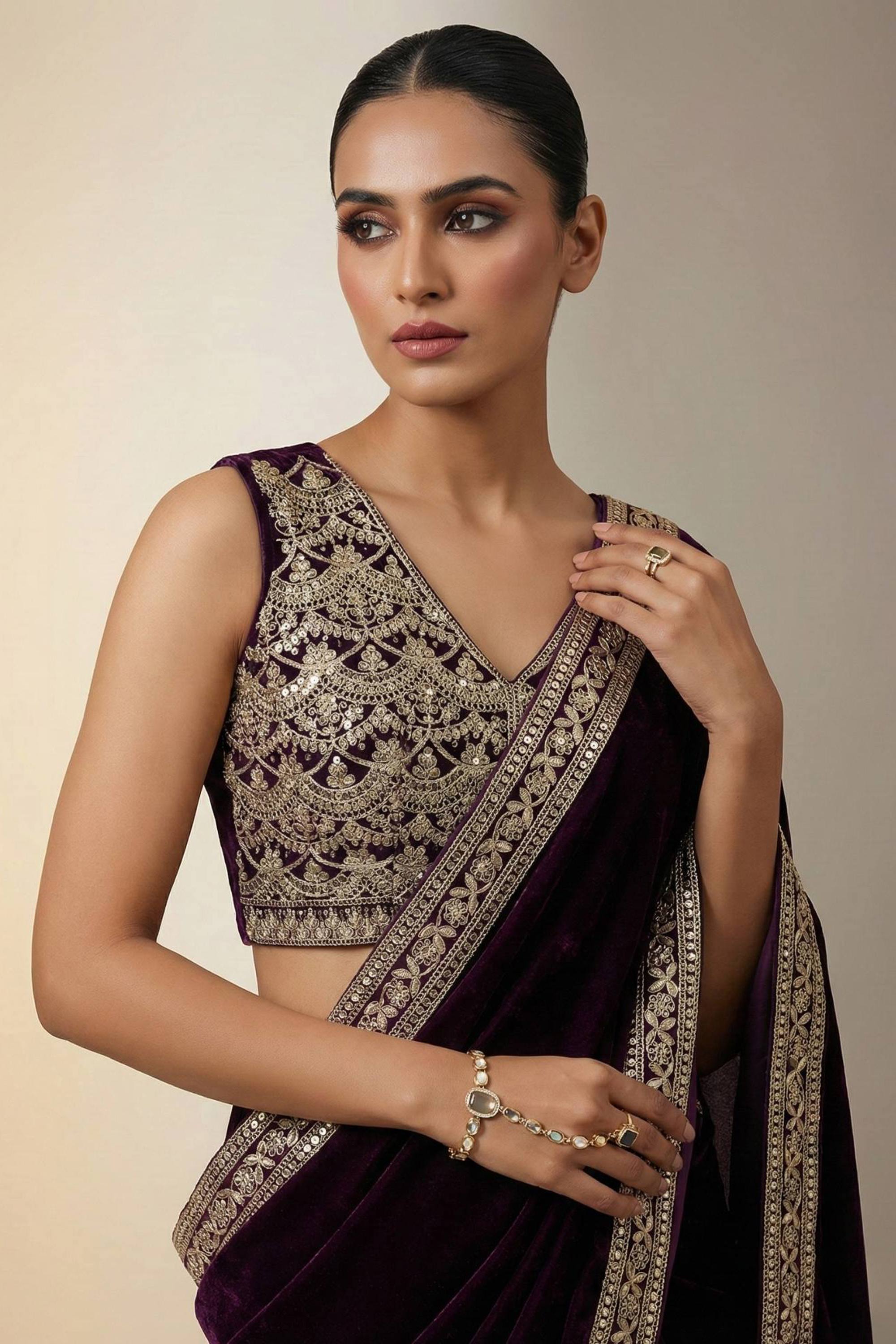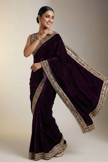 Border Work Viscose Velvet Wine Saree For Party Wear
