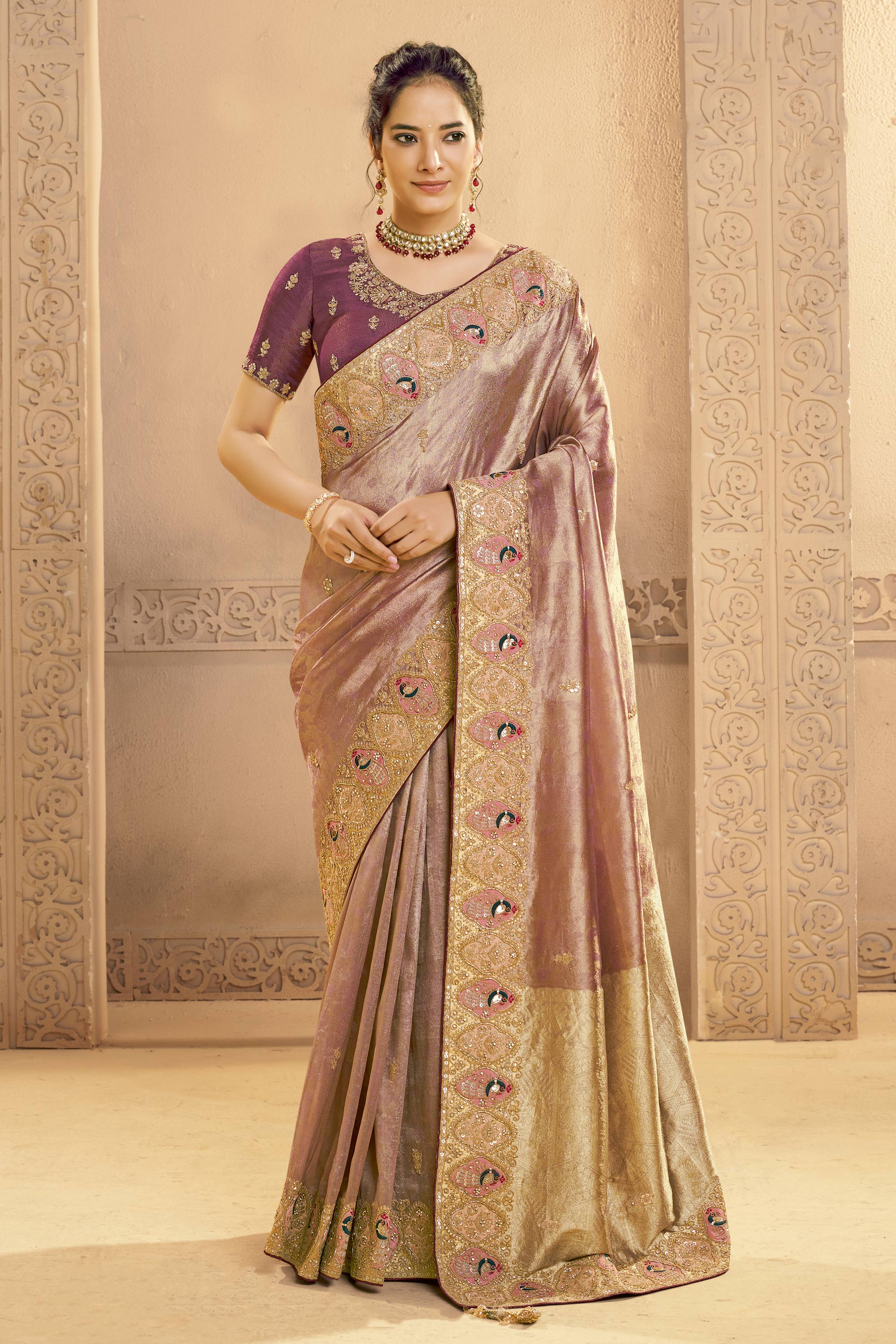 Border Work Wine Wedding Wear Saree