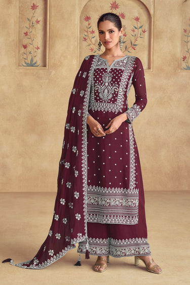 Burgundy Color Embroidered Palazzo Salwar Suit In Georgette Fabric