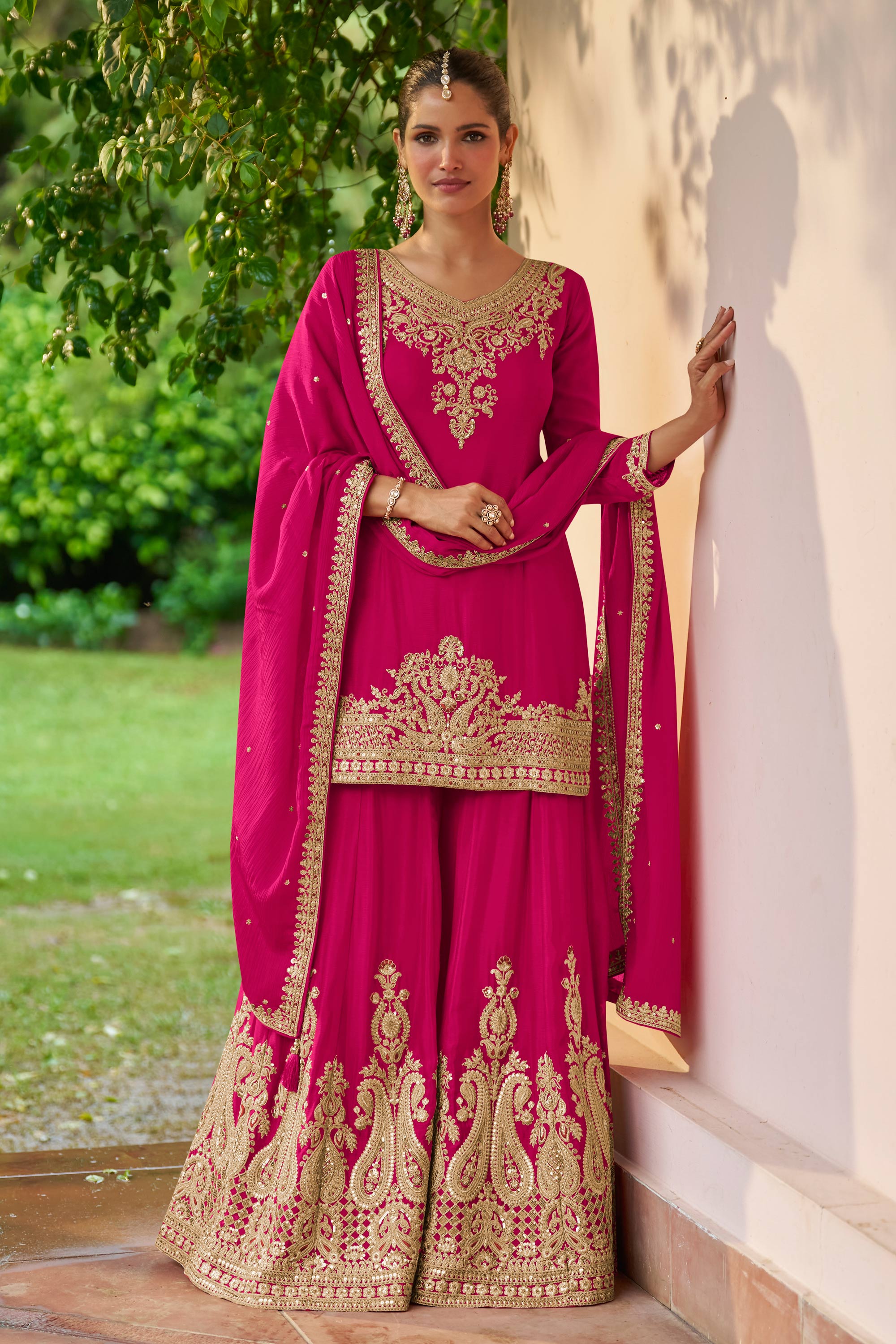 Add a touch of effortless grace to your festive wardrobe with this beautifully crafted Salwar Kameez Palazzo Suit. Designed in premium Real Chinon fabric, the top, bottom, and dupatta offer a soft, flowy drape that ensures all day comfort while maintaining a rich and stylish look for functions; please note that due to digital photography, slight color variations may occur.