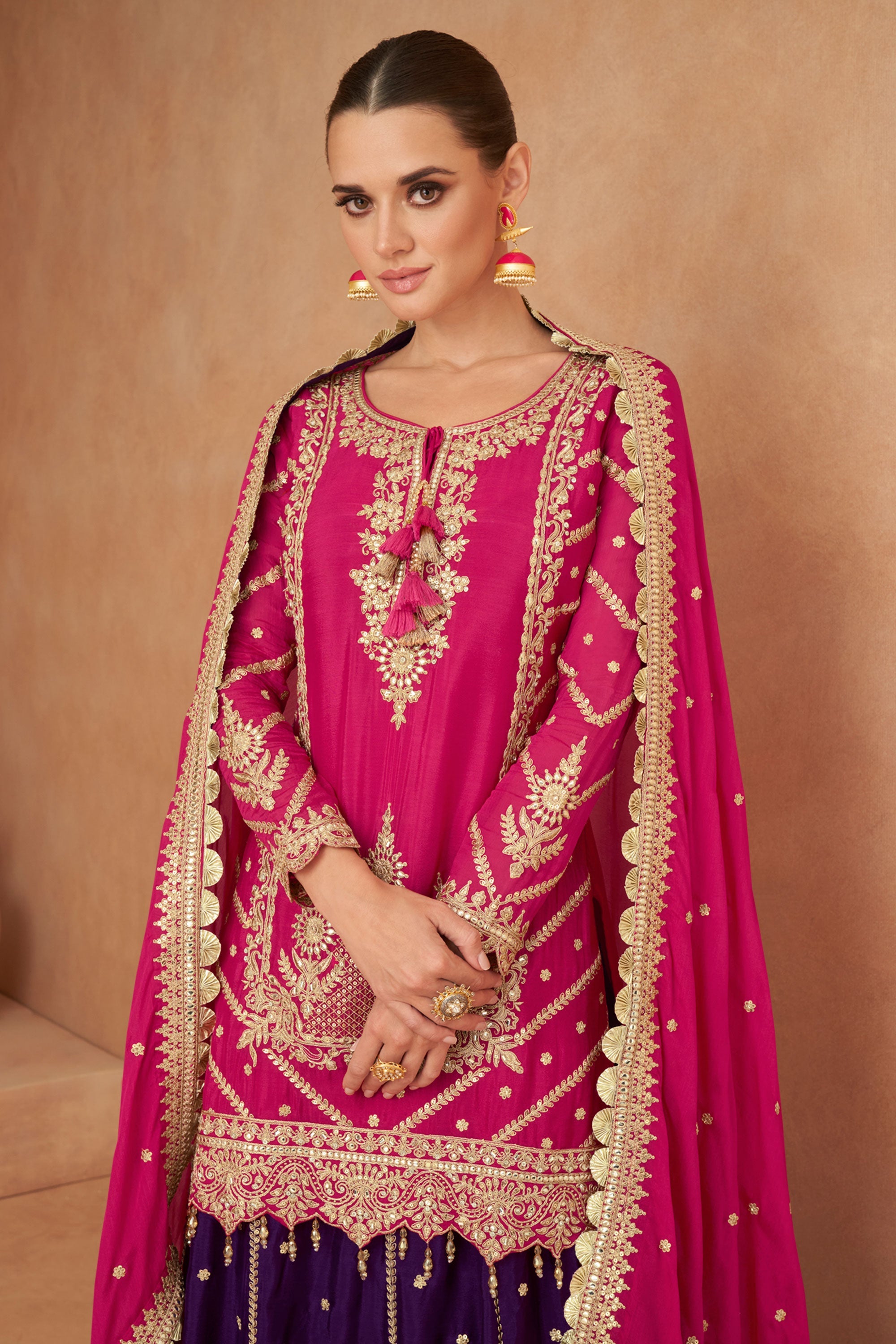 Step into elegance with our Chinon Embroidered Festive Wear Readymade Sharara Top Lehenga. Crafted from premium quality Chinon fabric, this attire features intricate embroidery that enhances its visual appeal. Designed for comfort and style, the readymade sharara top and lehenga make getting dressed a breeze. Ideal for festive events, this outfit allows you to enjoy the celebration without compromising on style or comfort.