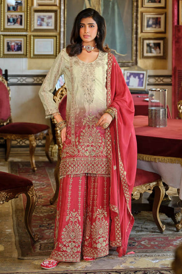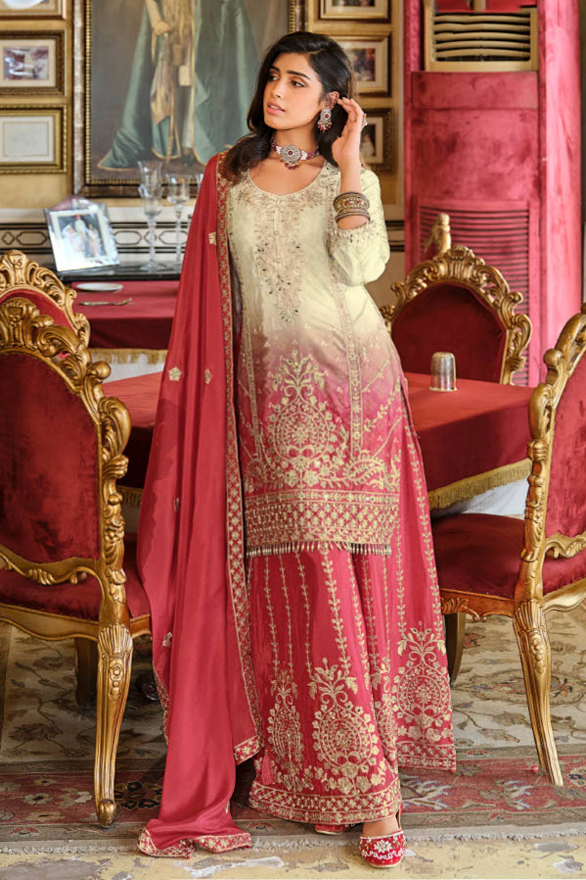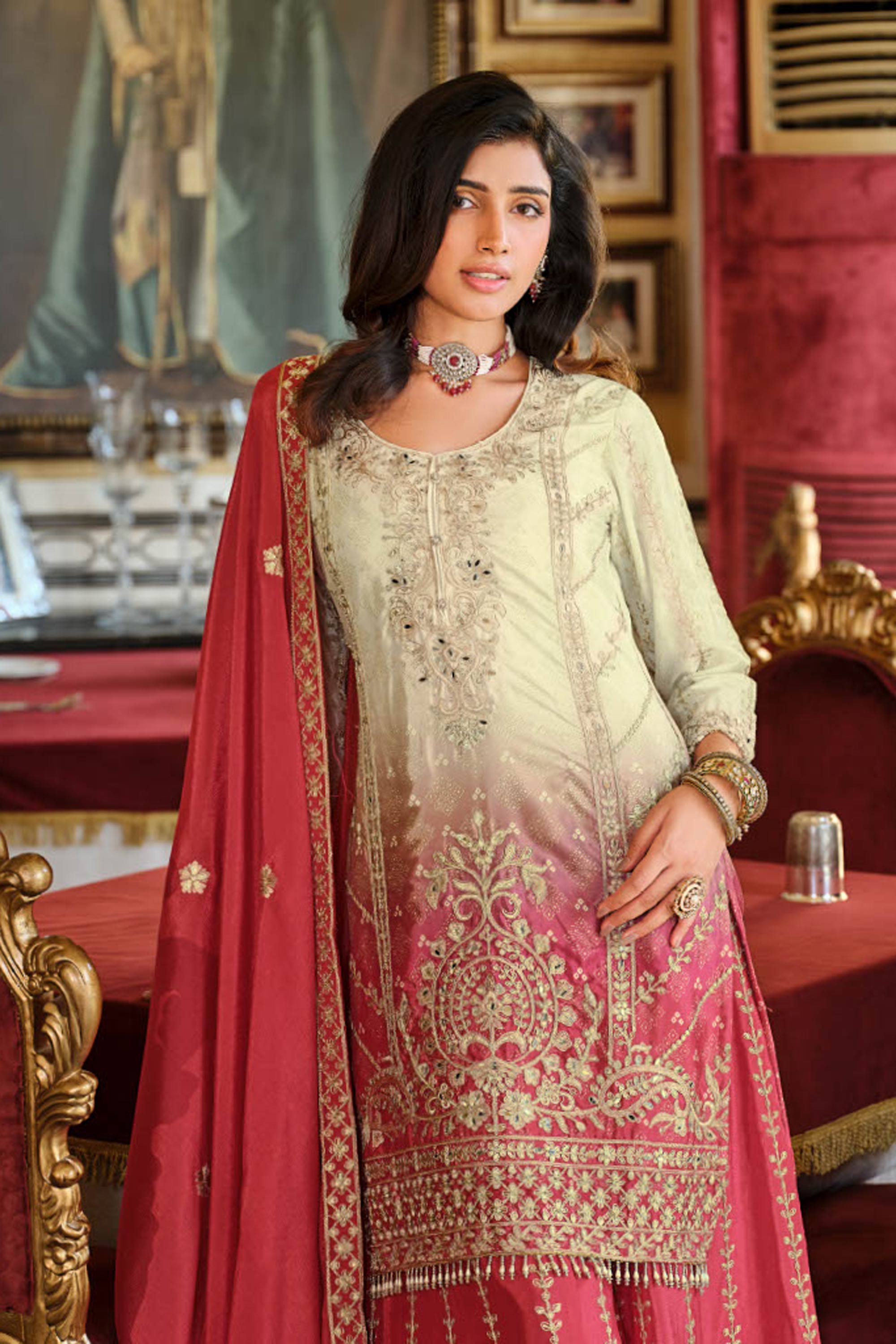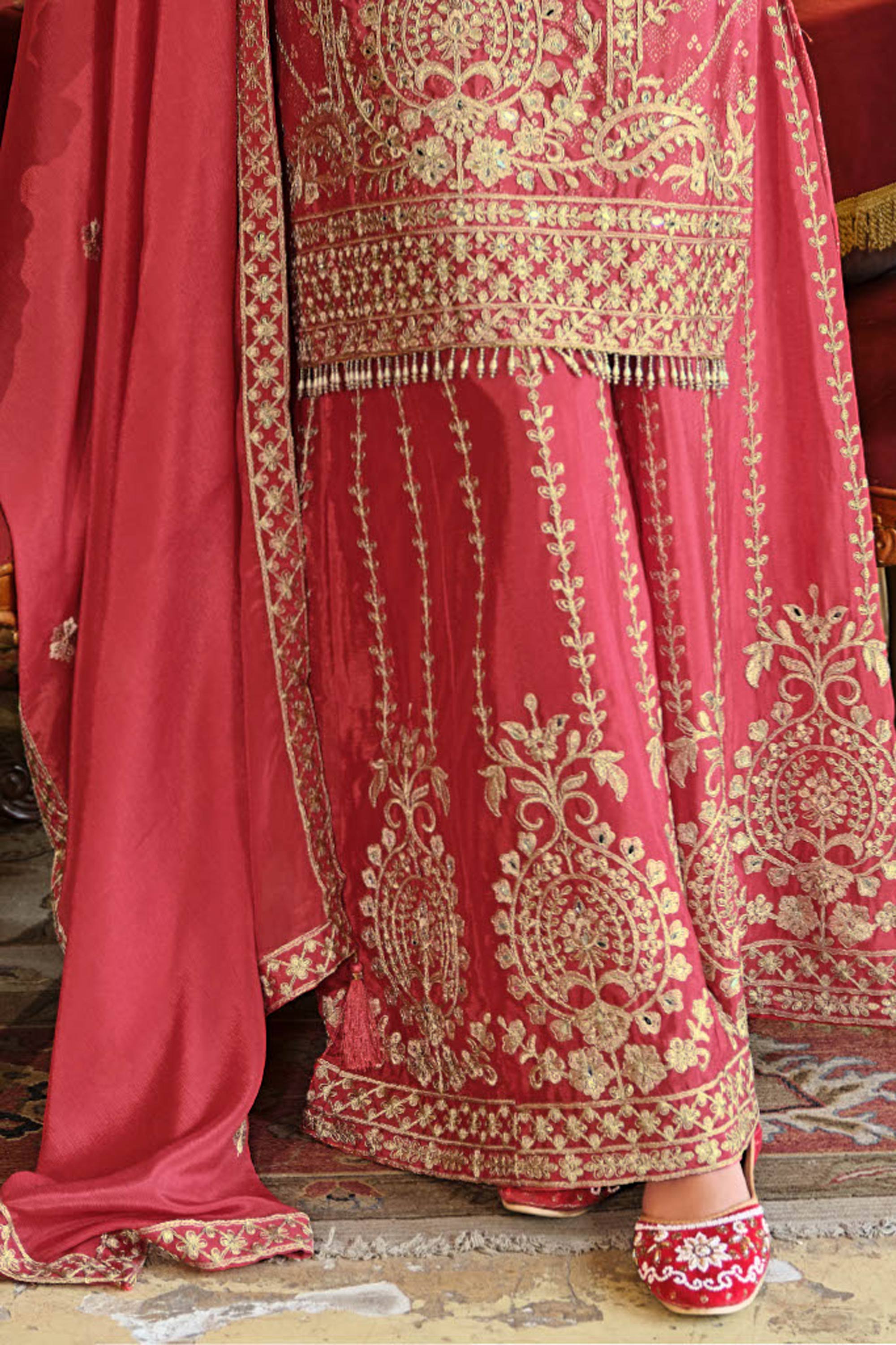 Detailed with exquisite embroidery work, this palazzo suit adds festive sparkle ideal for a Sangeet occasion. The attractive rich color beautifully complements the intricate craftsmanship, making it a standout choice for Sangeet ceremonies, festivals, and special celebrations, and due to digital photography, slight color variations may occur.