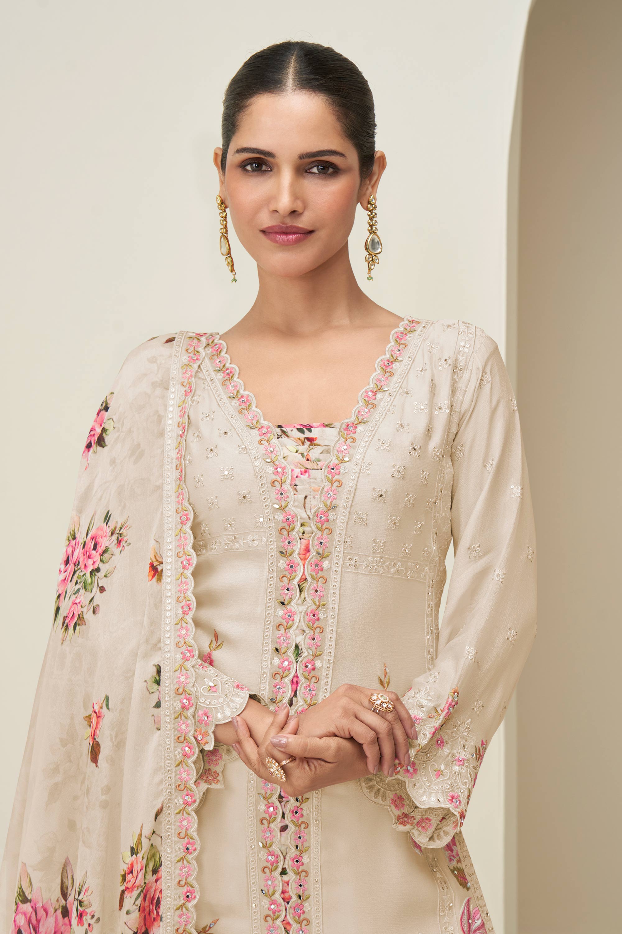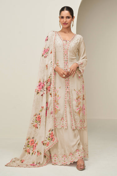 Chinon Silk Embroidered Beige Readymade Palazzo Suit For Sangeet Wear