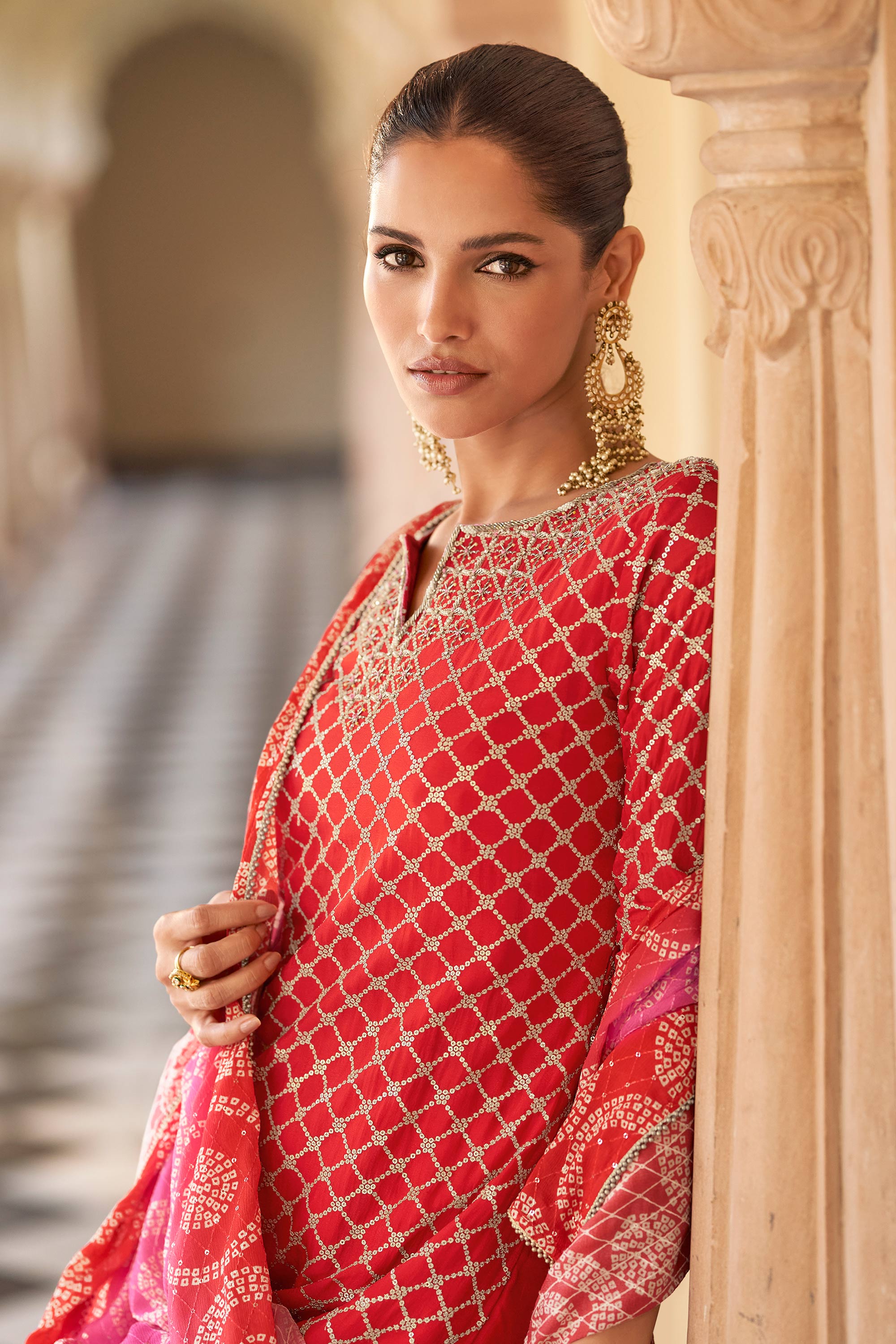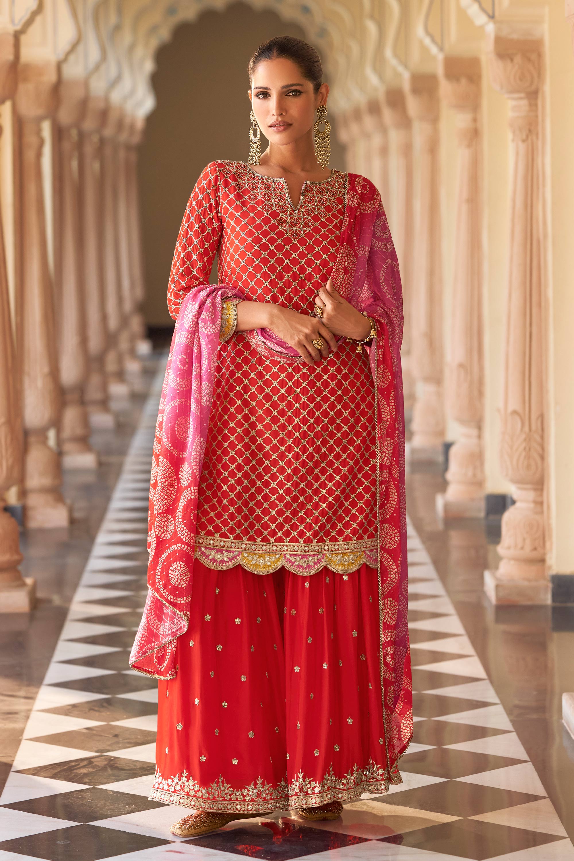 Chinon Silk Embroidered Red Festive Wear Readymade Sharara Style Salwar Suit