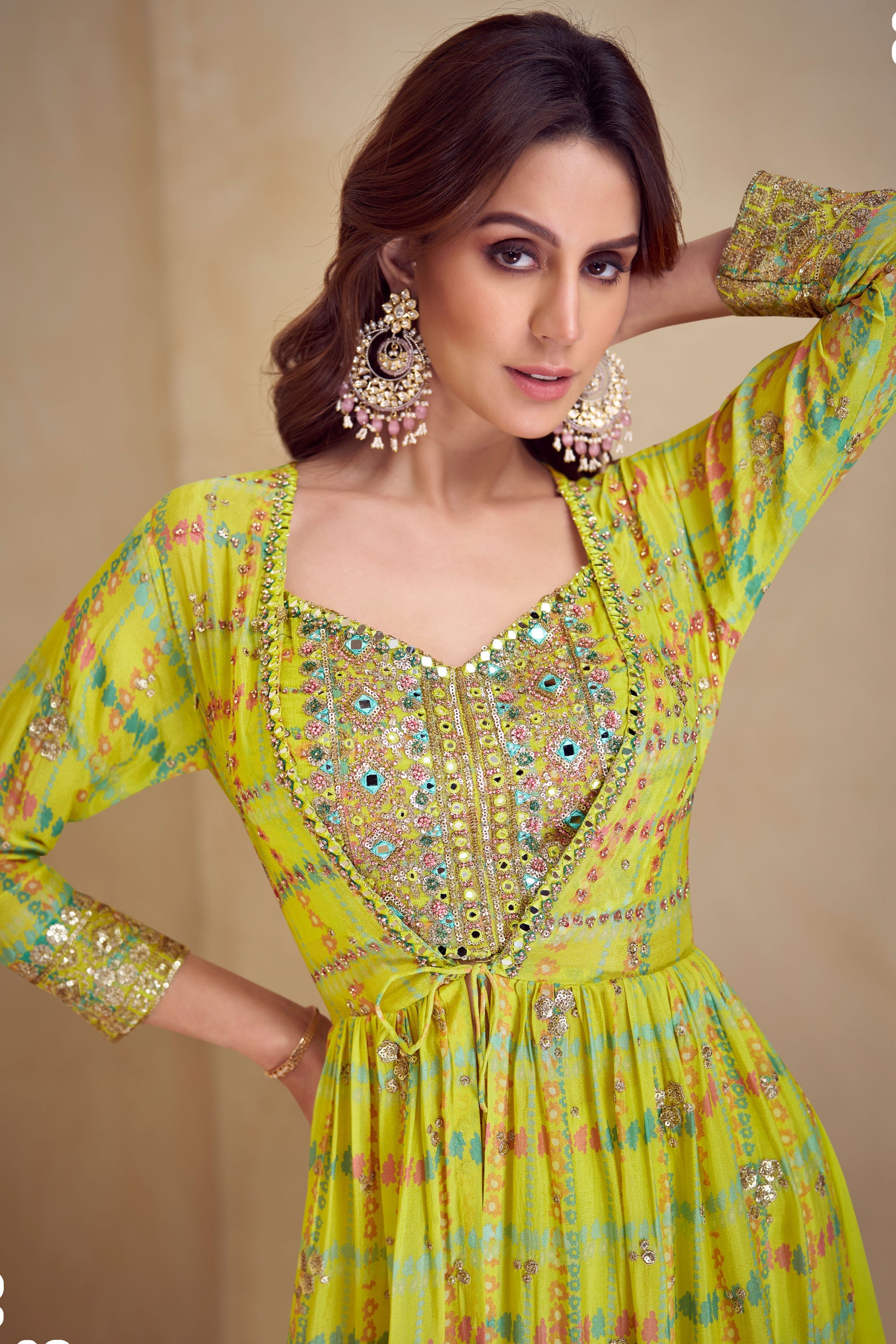 Elevate your traditional attire with the Reach Color Chinon Digital Print Antique Indo Western Suit. Designed for grand celebrations like weddings, festivals, or sangeet ceremonies, this outfit is crafted to deliver unmatched style and comfort. The delicate digital prints on premium Chinon fabric offer a fine blend of modern craftsmanship and traditional beauty. The antique-inspired detailing adds an exclusive touch, making this suit ideal for standout moments. To ensure the longevity of this beautifully designed outfit, dry cleaning is recommended. Kindly note that there may be minor differences in color due to screen variations.