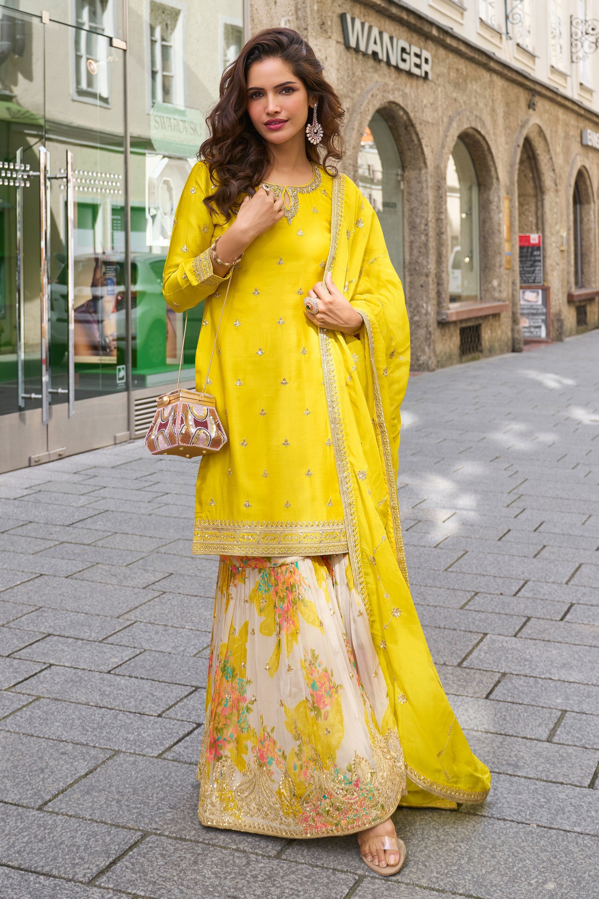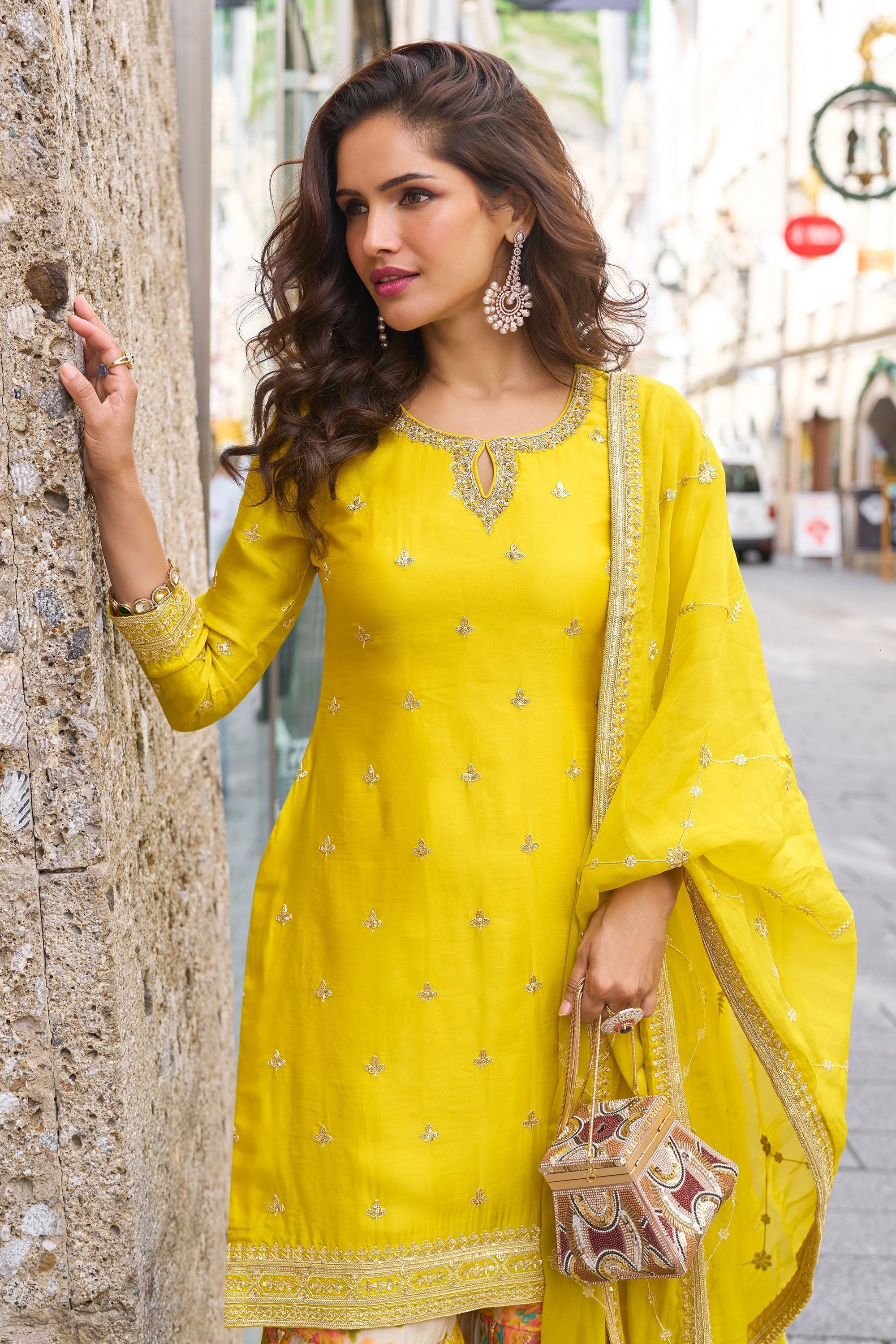 Chinon Yellow Embroidered Readymade Palazzo Salwar Kameez