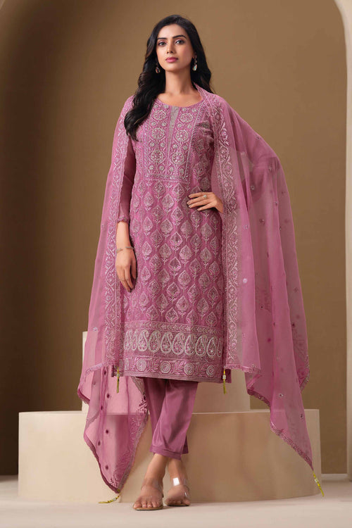Classic Purple Embroidered Straight Cut Dress In Chiffon Fabric