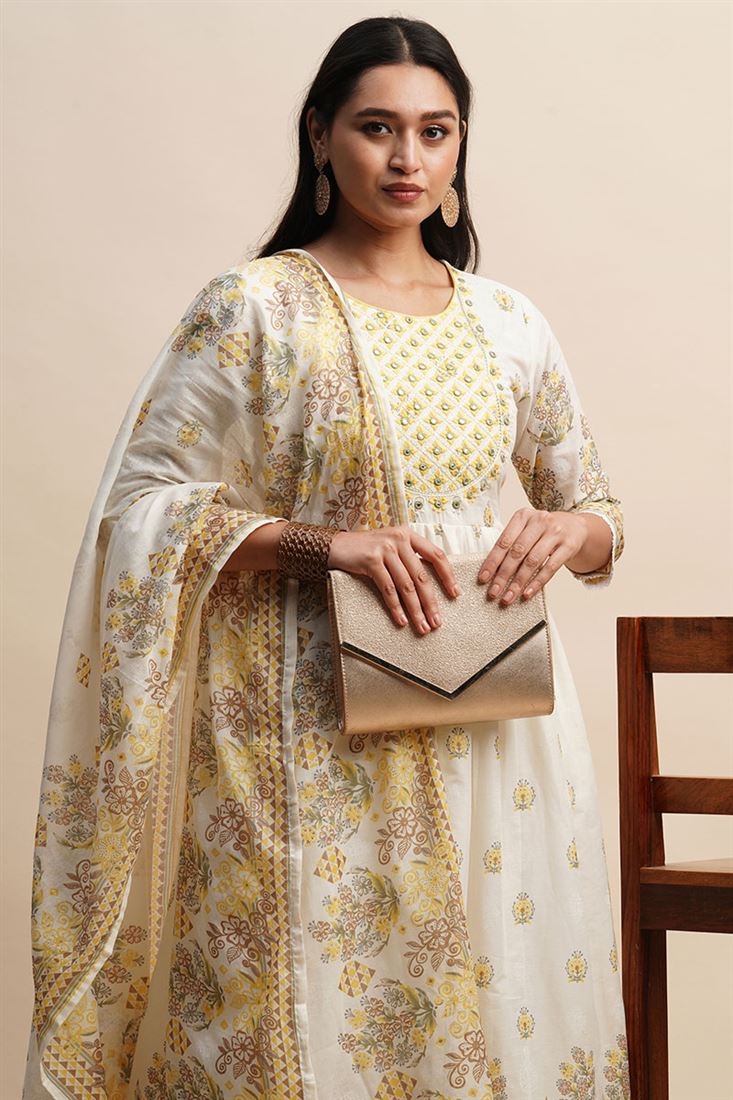 Crafted with attention to detail and precision, this White And Yellow Color Salwar Suit offers both style and durability. The cotton fabric ensures easy maintenance and longevity, making it a reliable addition to your collection.