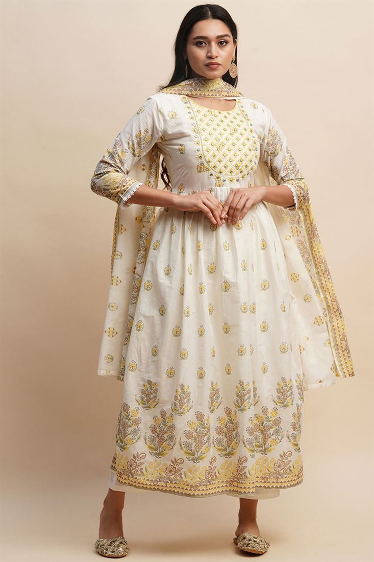 Comfortable Printed Salwar Suit in White and Yellow Color Cotton Fabric
