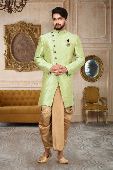 Cotton Sea Green Color Wedding Wear Readymade Designer Men Indo Western With Dhoti