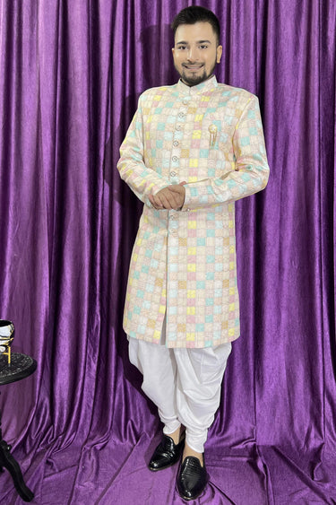 Cream Color Cotton Fabric Wedding Wear Readymade Peshawari Style Indo Western For Men