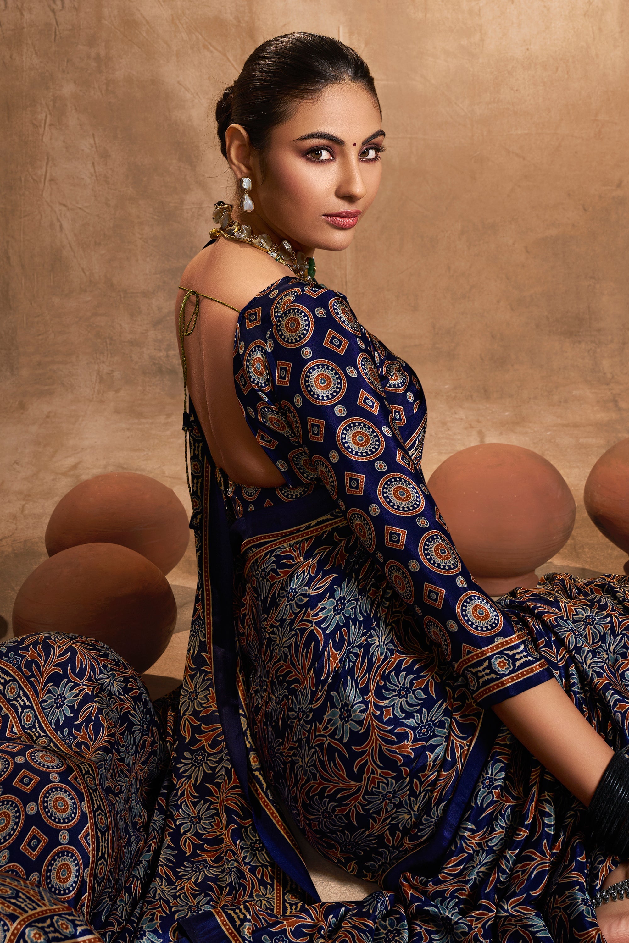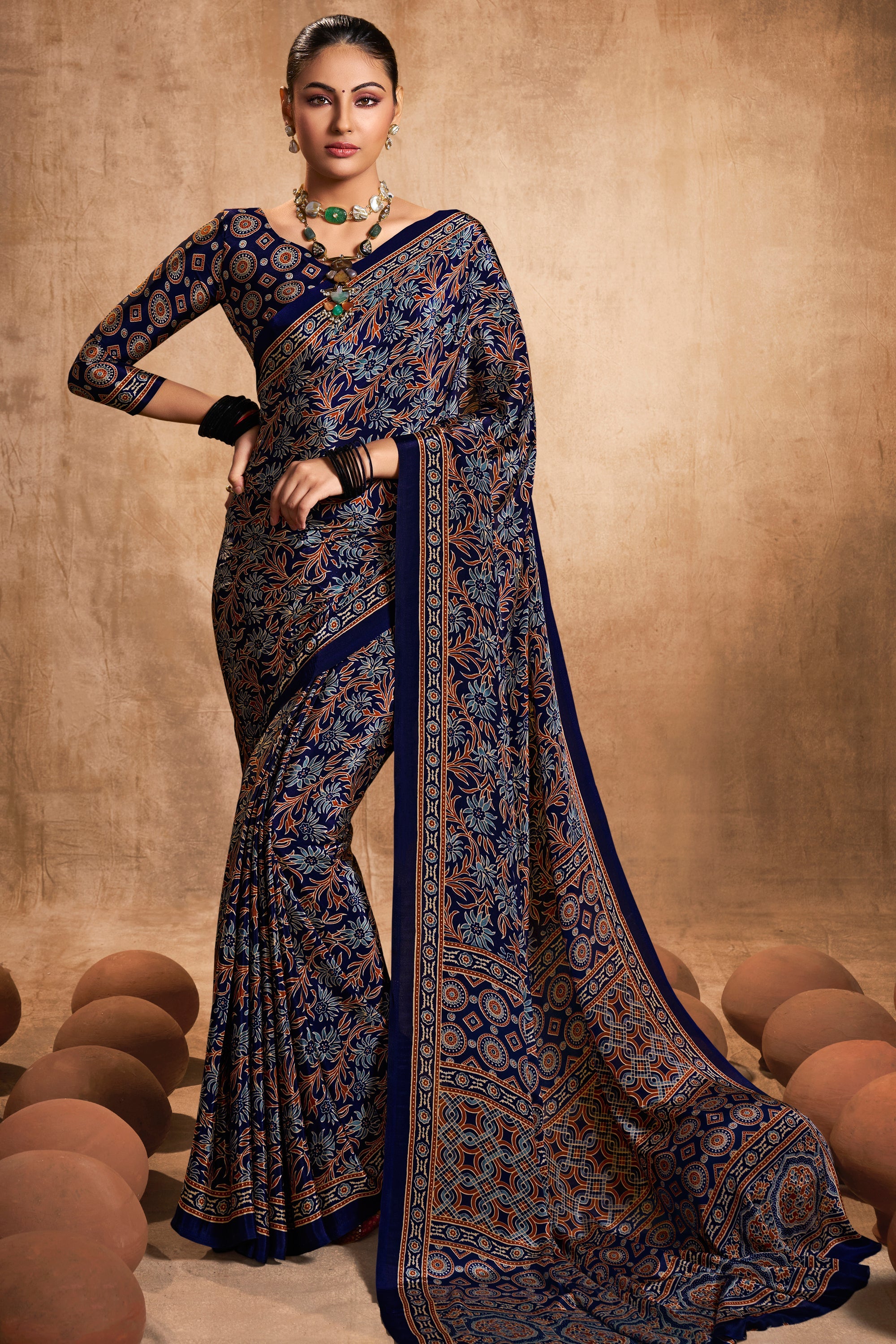 Crepe Silk Fabric Classic Casual Wear Navy Blue Color Printed Saree