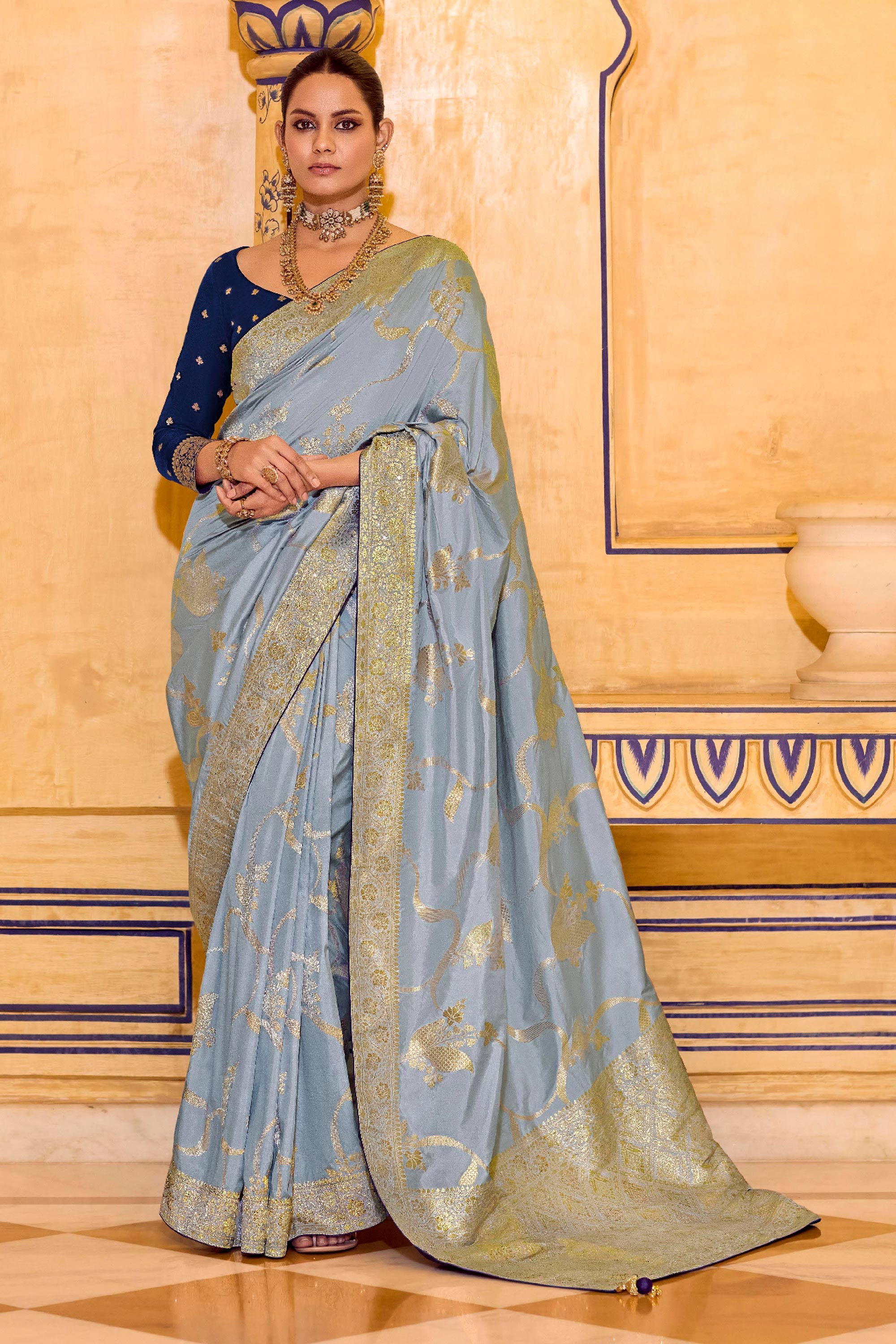 Crepe Silk Weaving Work Grey Wedding Wear Saree