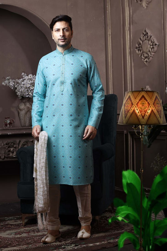 Cyan Color Cotton Fabric Wedding Wear Stylish Readymade Kurta Pyjama For Men