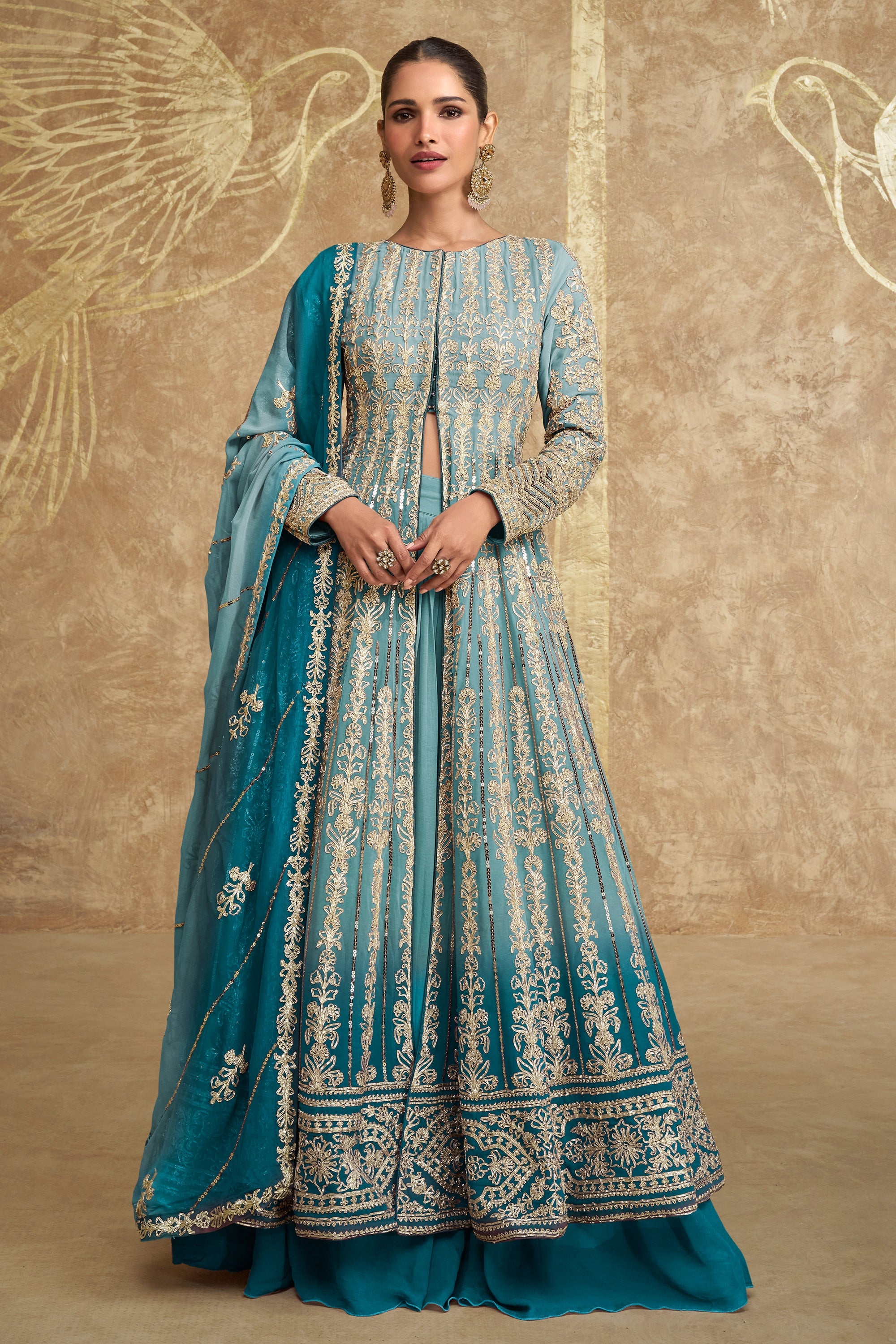 Cyan Color Georgette Stylish Readymade Long Top With Skirt
