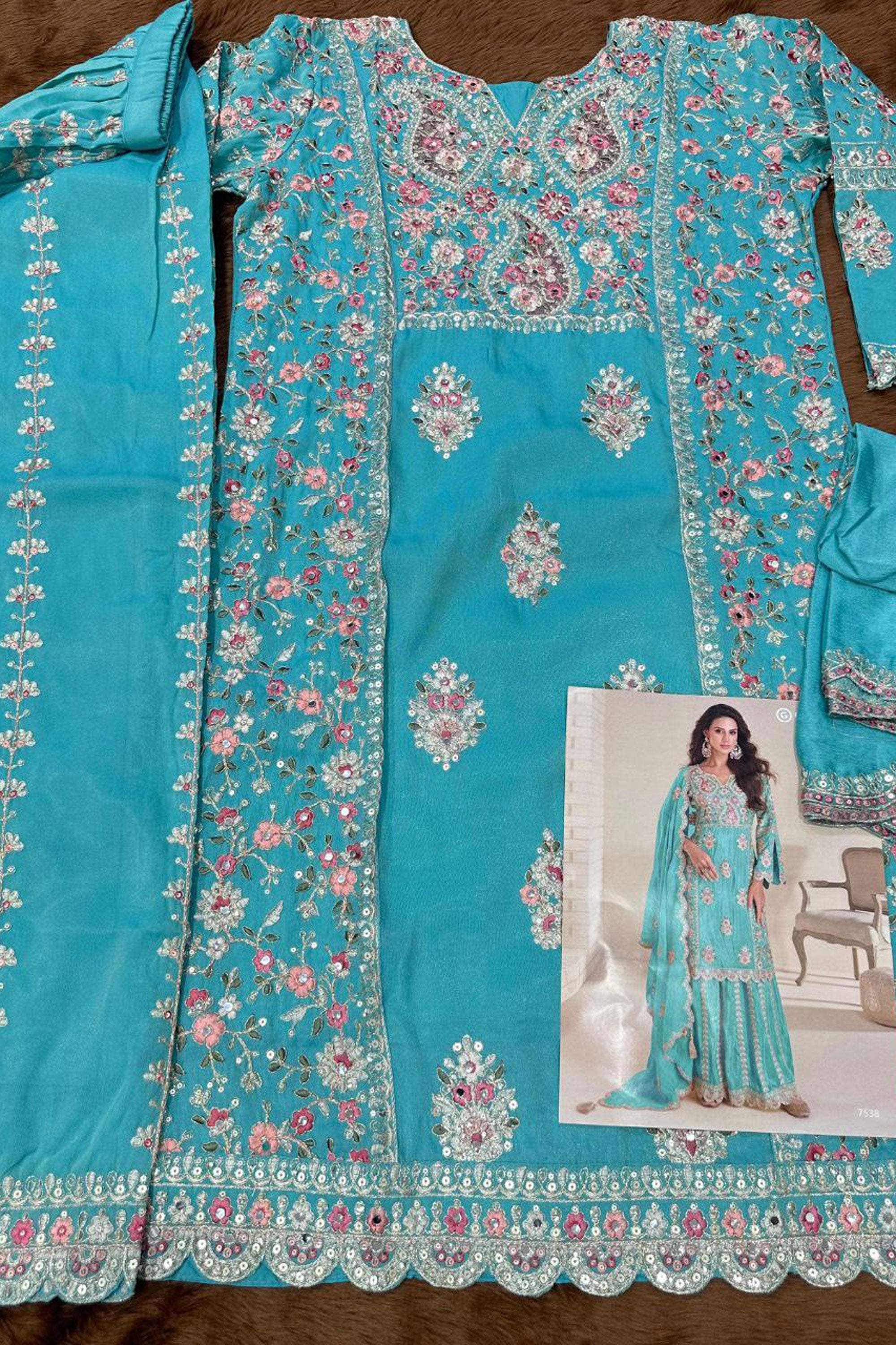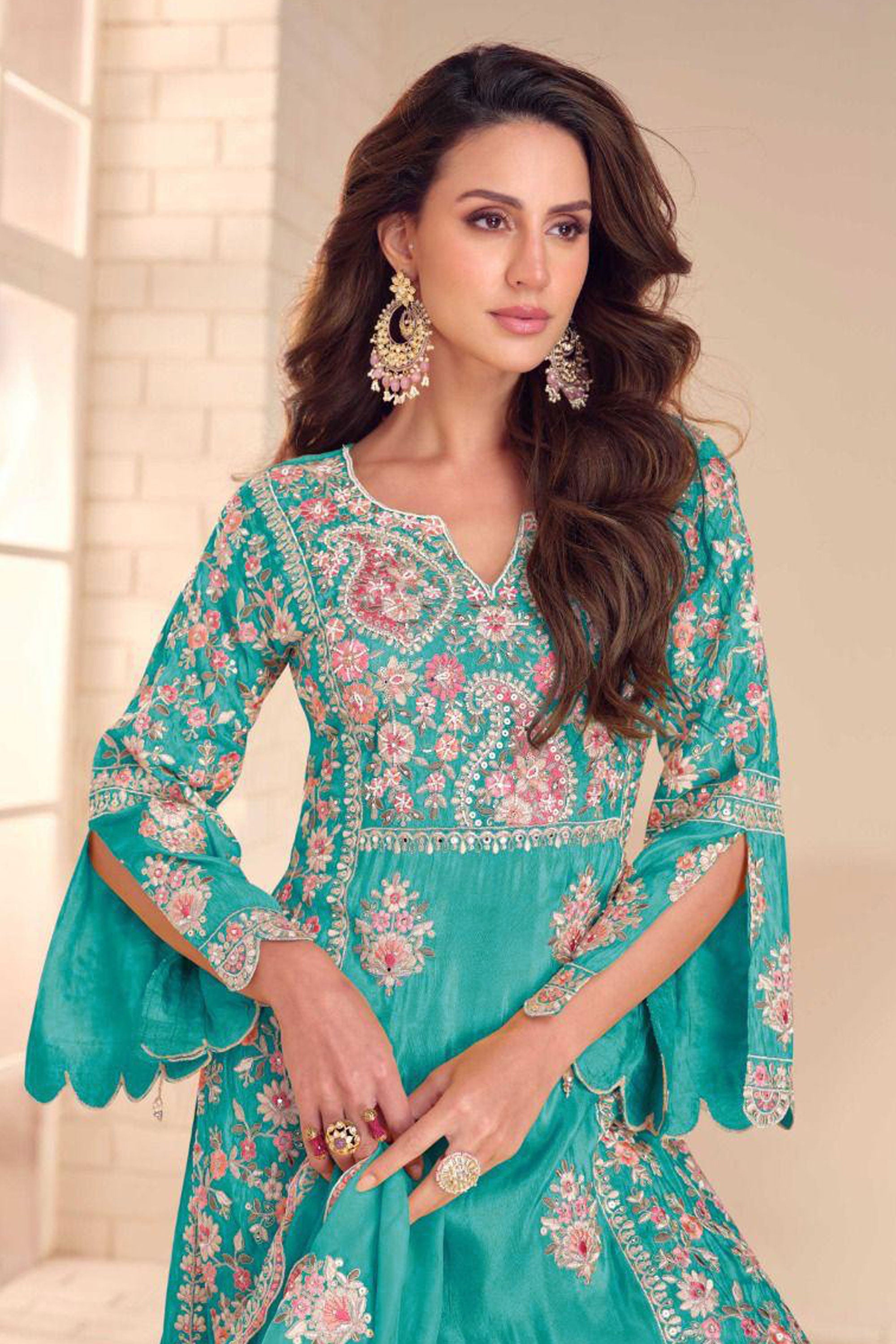 Cyan Embroidered Readymade Palazzo Salwar Suit Set