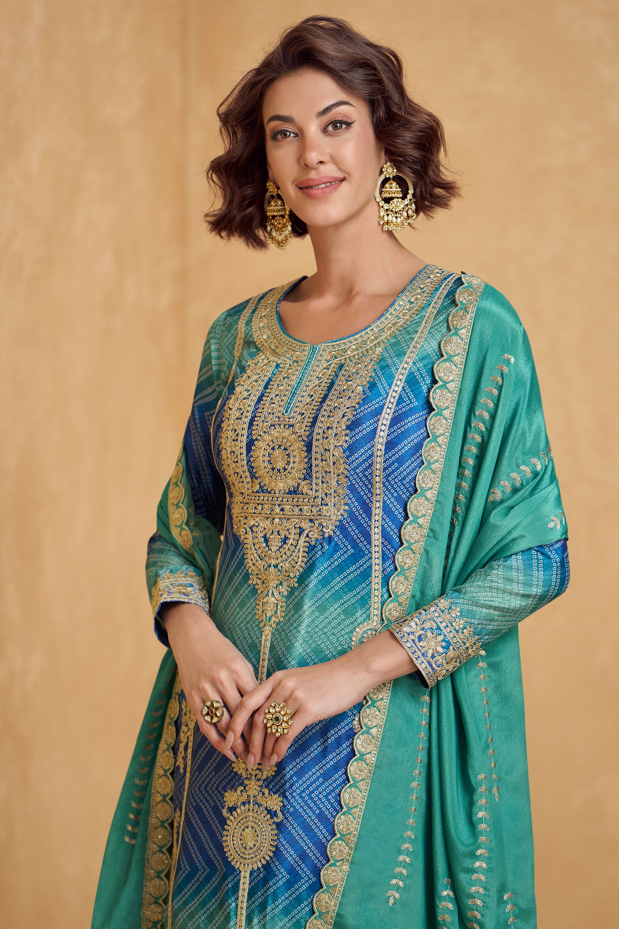 Cyan Embroidery Work Readymade Sharara Style Salwar Kameez