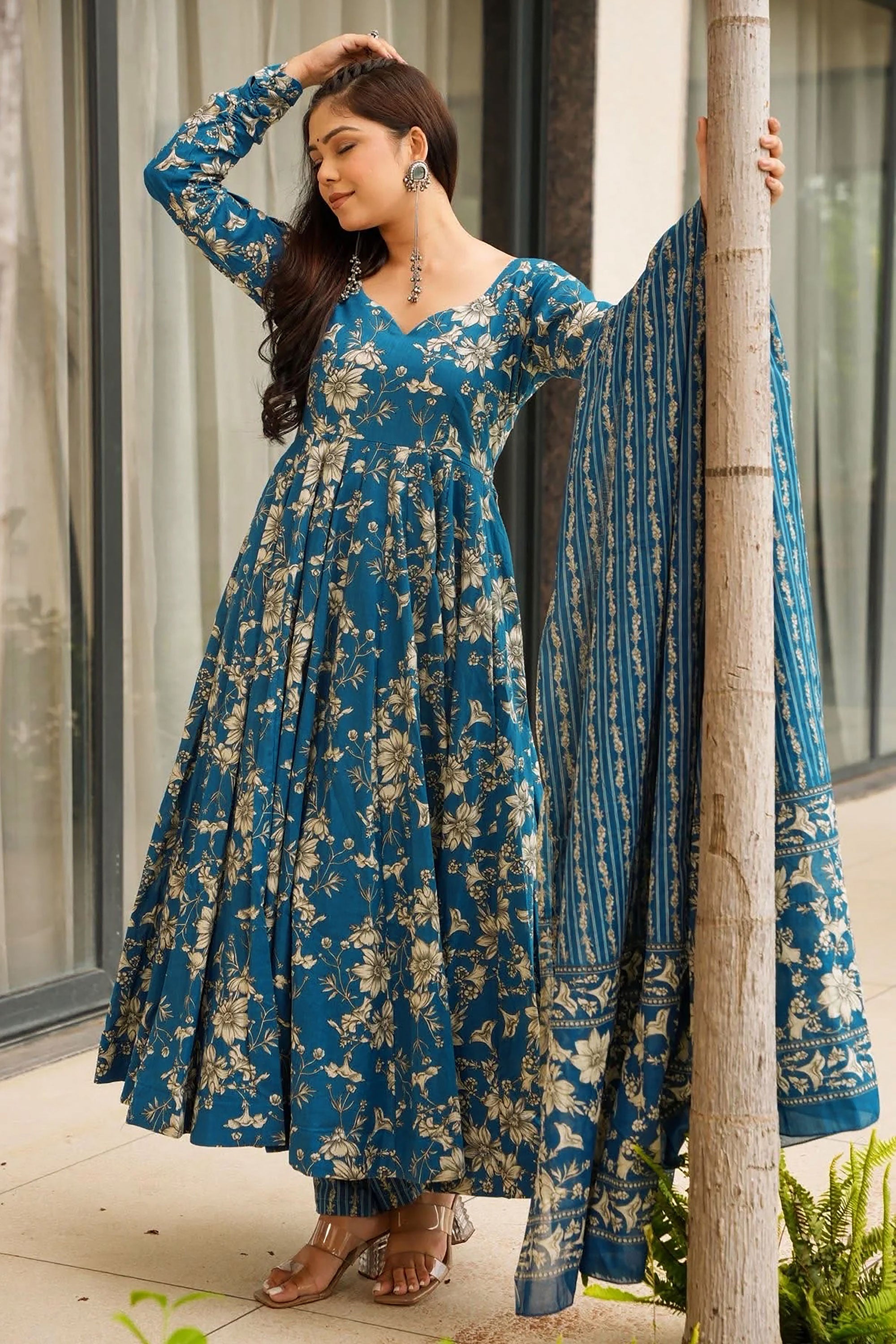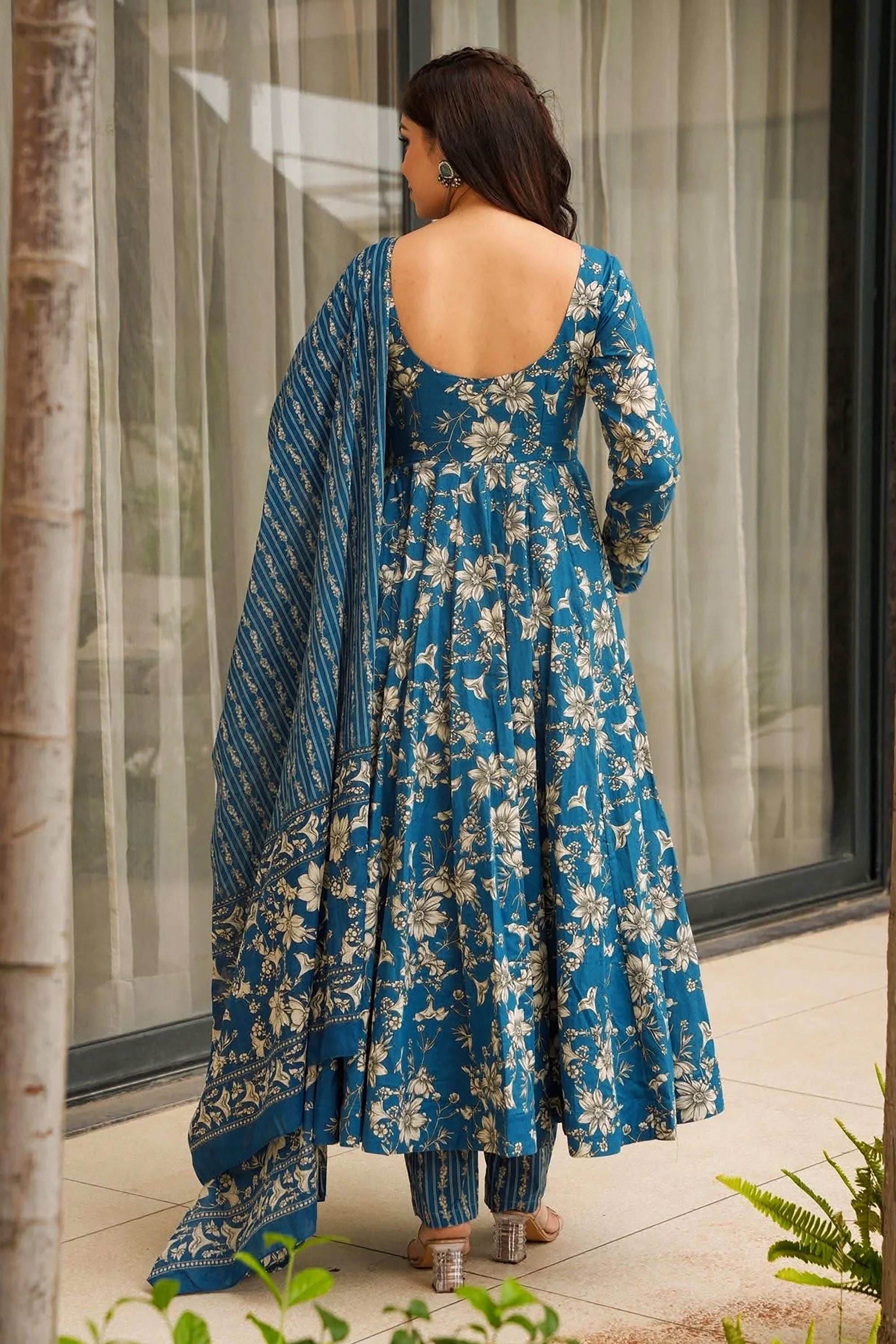 Cyan Printed Muslin Readymade Anarkali Suit