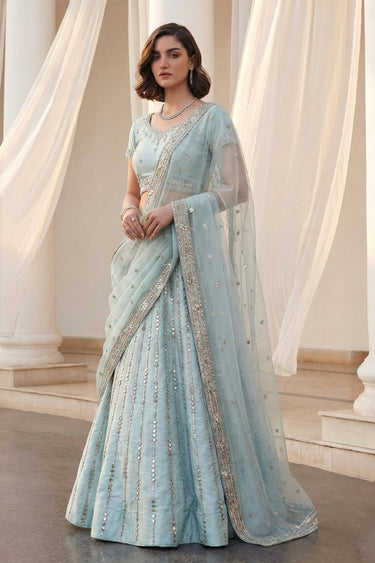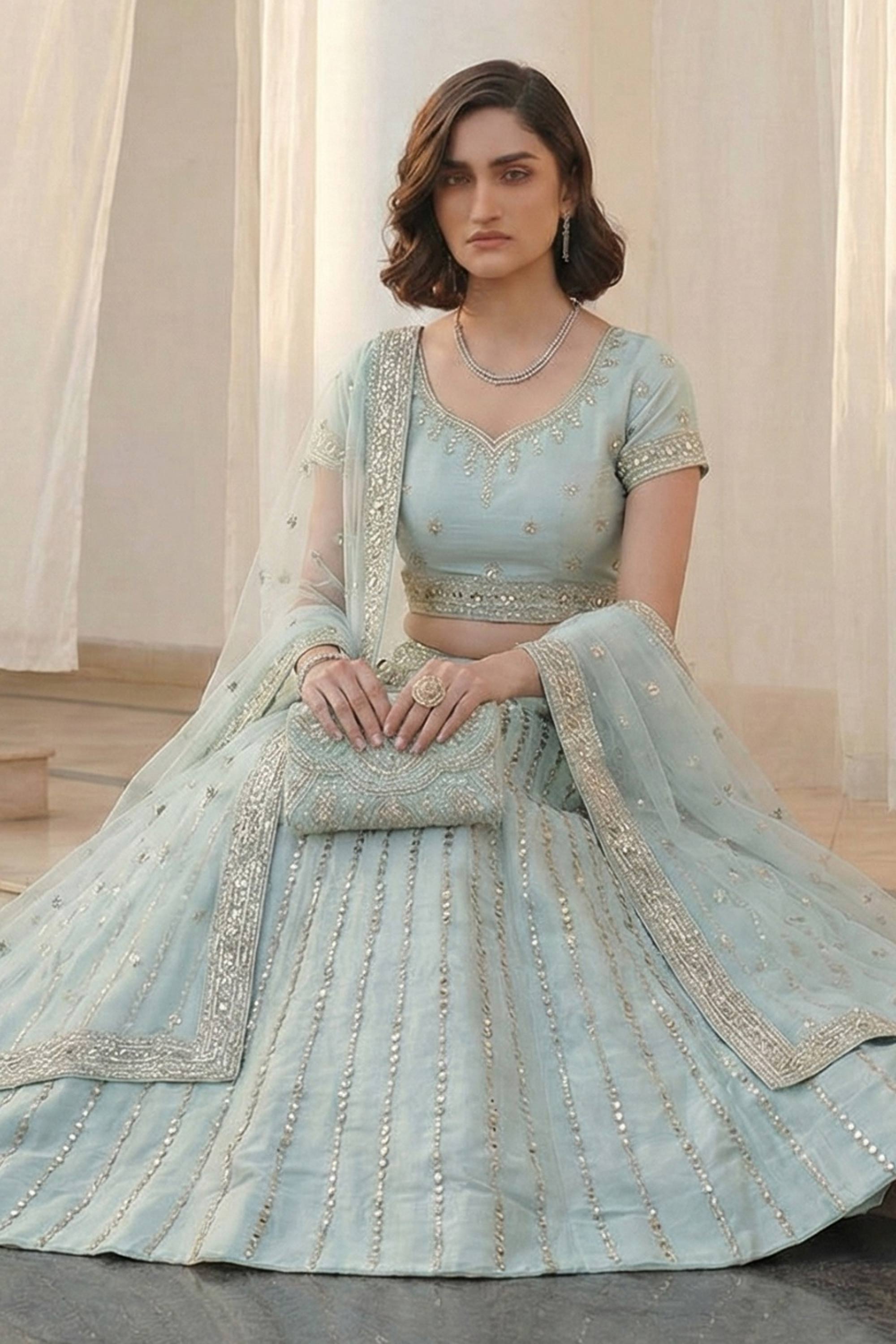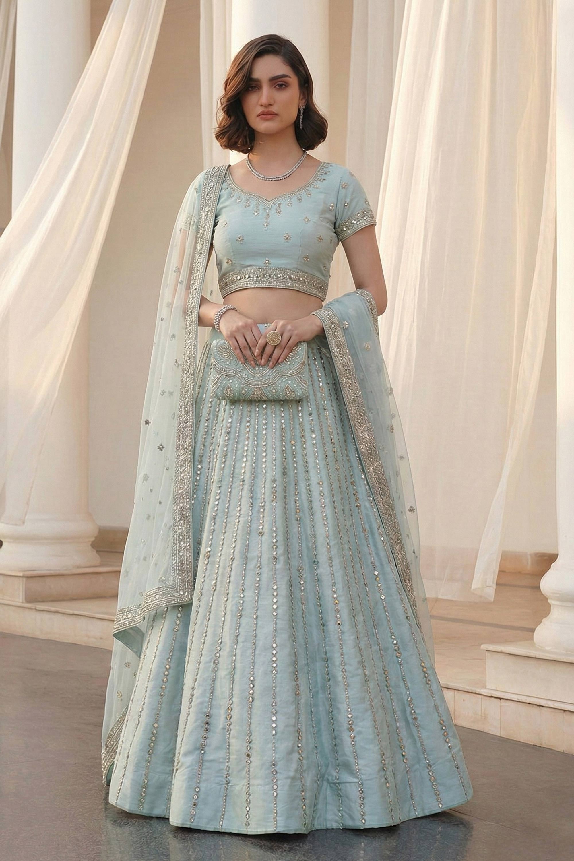 Cyan Wedding Wear Silk Mirror Work Lehenga Choli