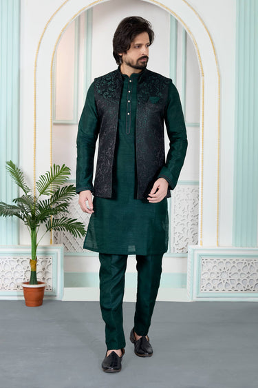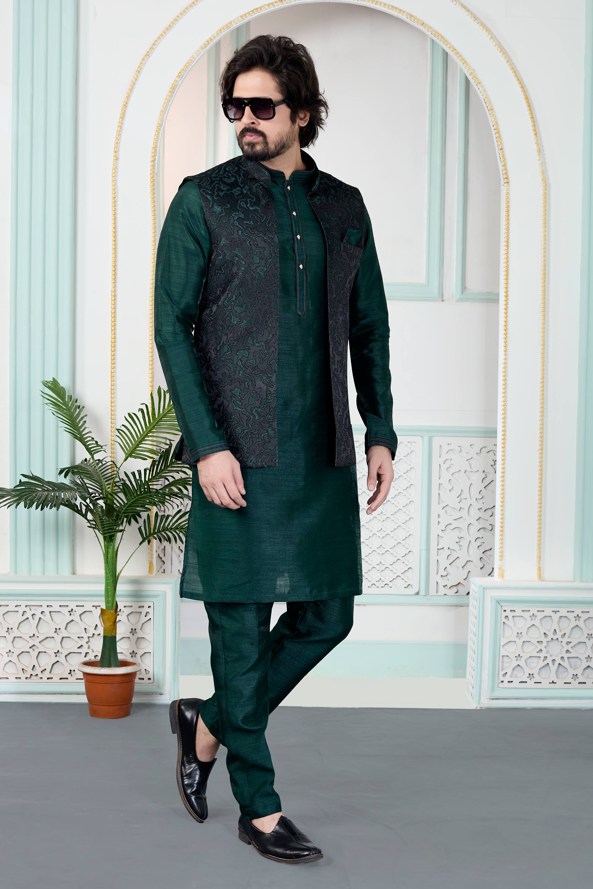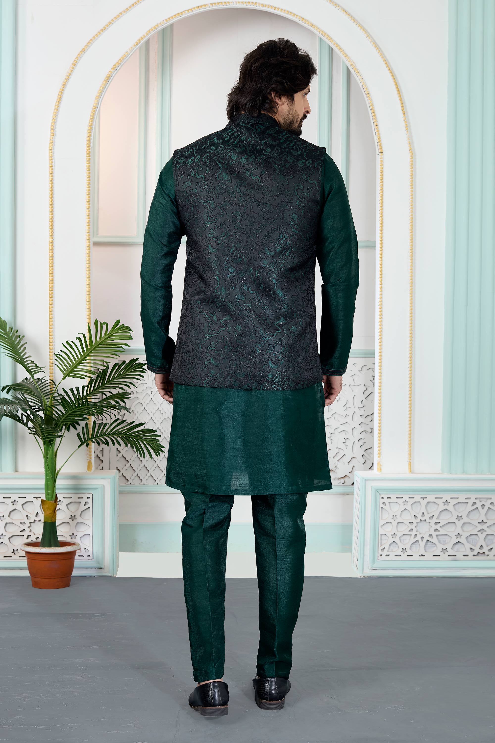 Dark Green Wedding Wear Jacquard Readymade Kurta And Aligadhi Pant For Men