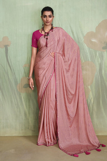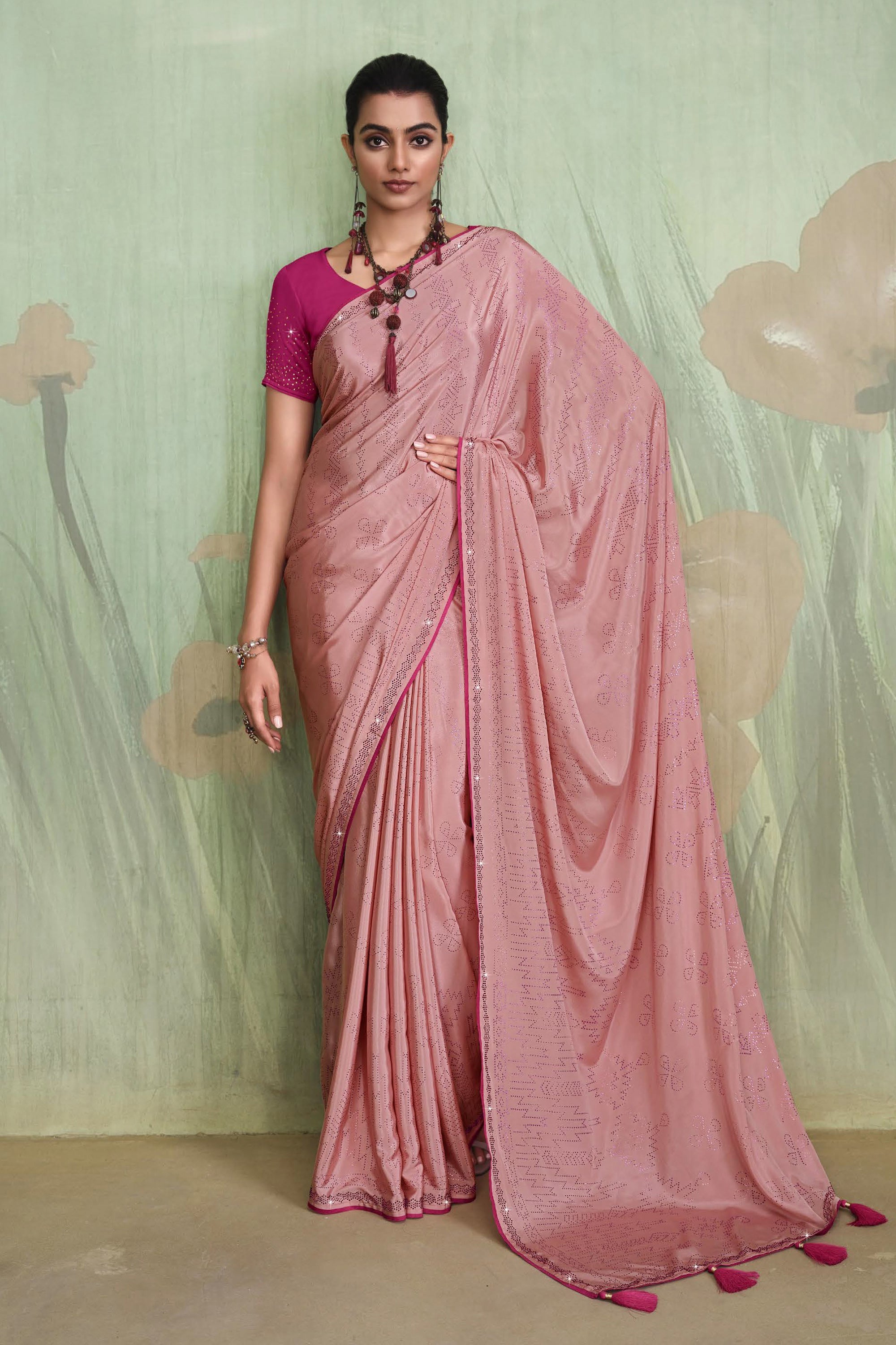 Dazzling Pink Color Satin Crepe Saree With Contrast Blouse