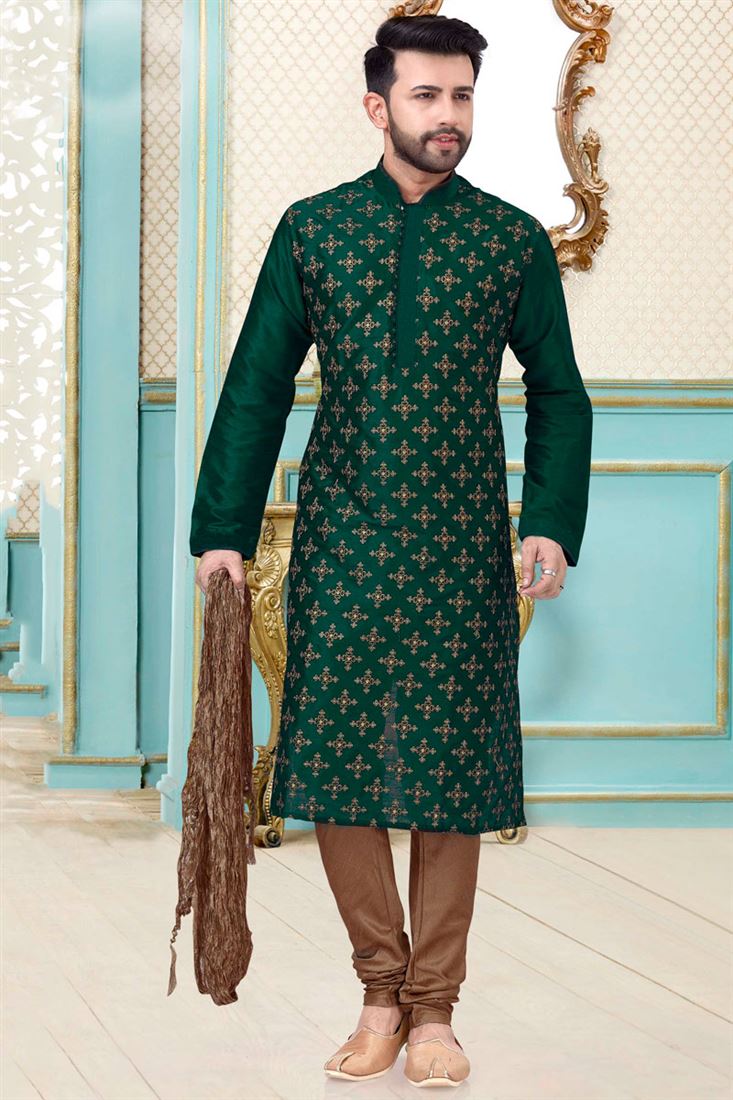 Dhupion Silk Fabric Wedding Wear Embroidered Work Kurta Pyjama For Men In Green Color