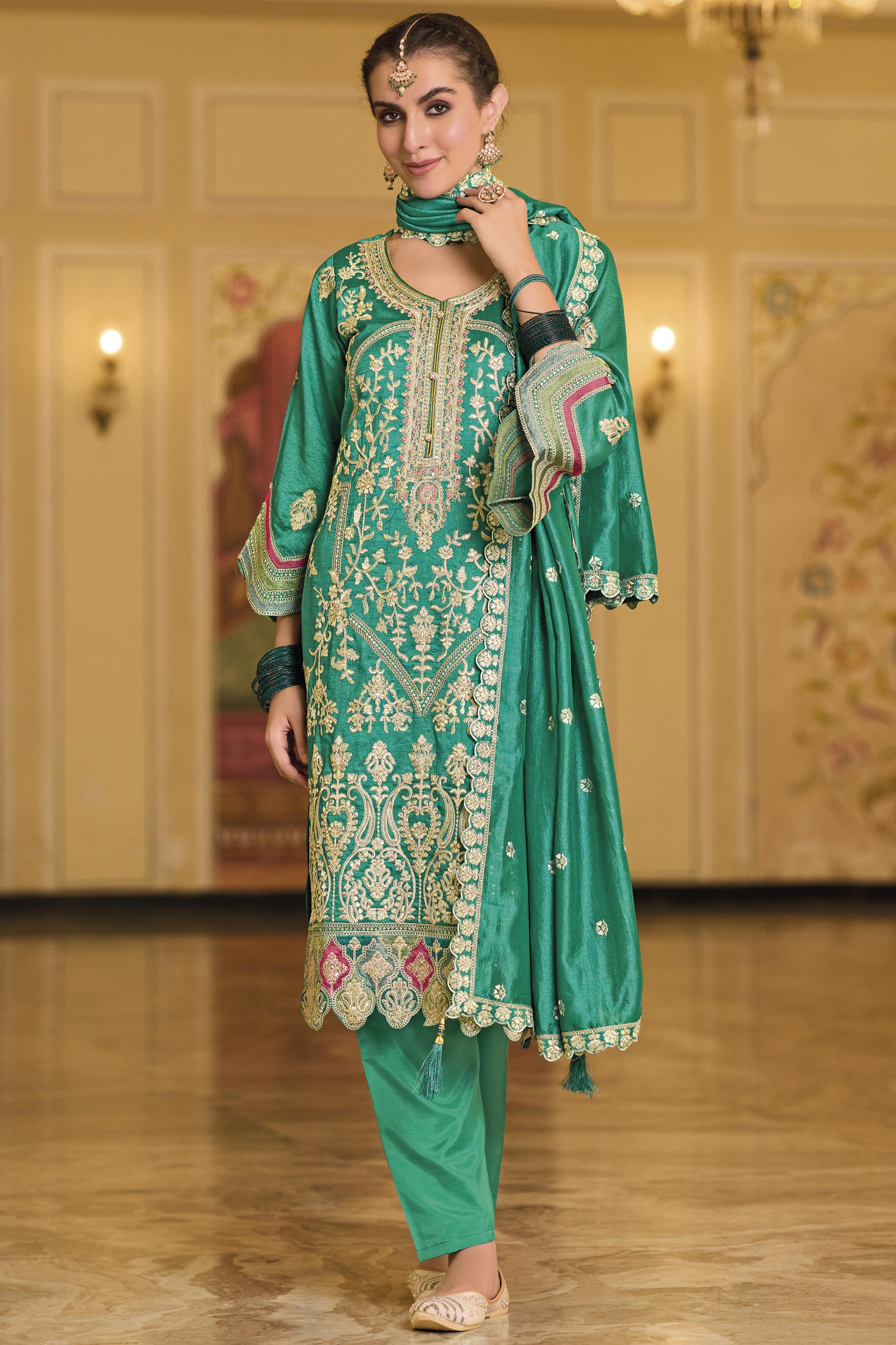Diwali Special Art Silk Fabric Green Color Embroidered Readymade Designer Salwar Suit