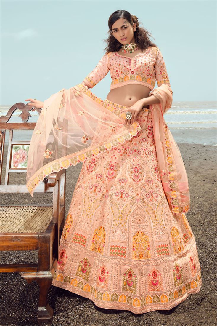 Elegant Georgette Fabric Peach Color Embroidered Lehenga